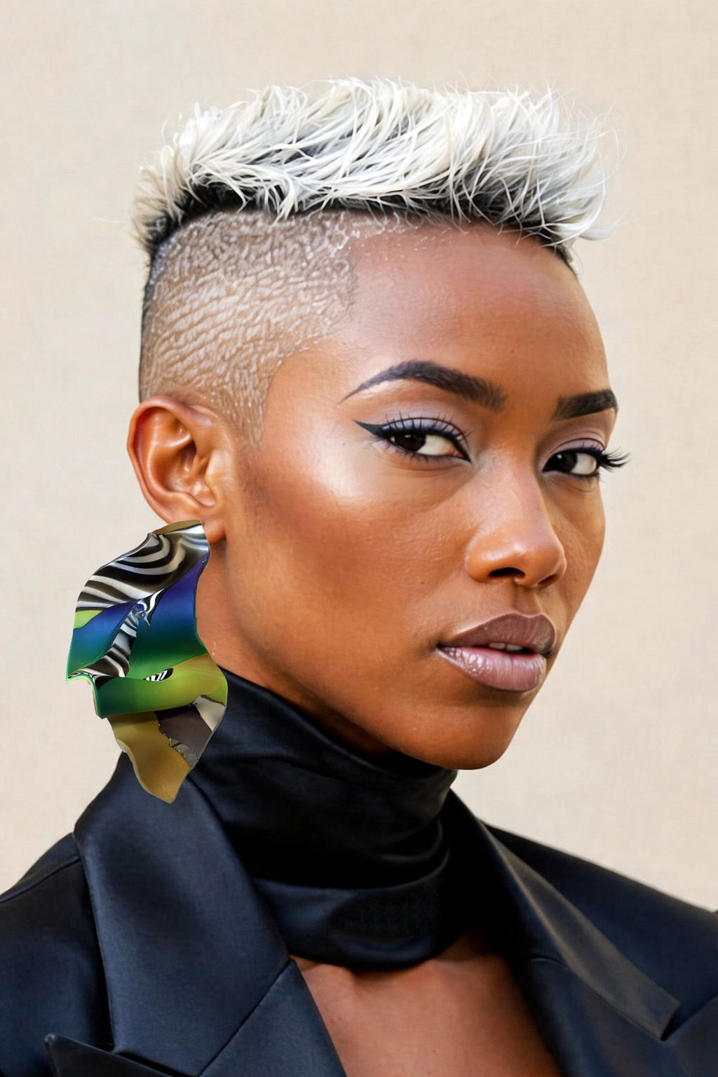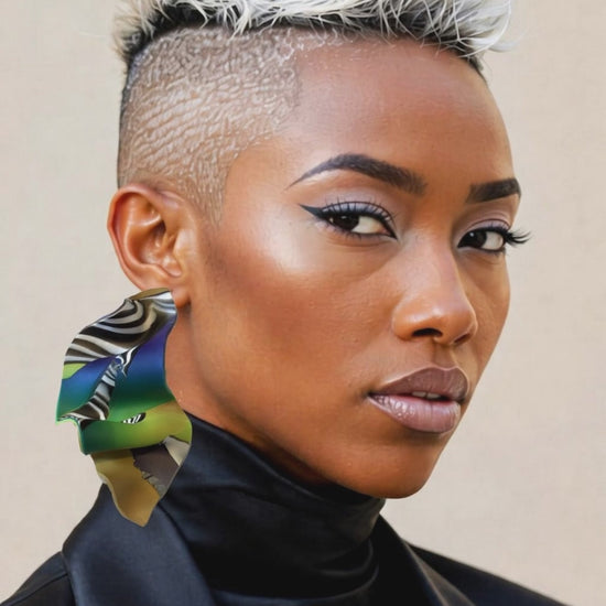 This eye-catching statement earring features a dynamic, sculptural silhouette with fluid folds and layered curves that create bold movement and dimension. Vibrant emerald green and deep ocean blue tones blend seamlessly with earthy gold accents and striking black-and-white zebra striping, resulting in a rich, marbled design that feels both modern and artistic. Crafted from lightweight polymer clay, this earring delivers dramatic impact without heavy wear. Each piece is uniquely patterned, making it a true wearable work of art.
