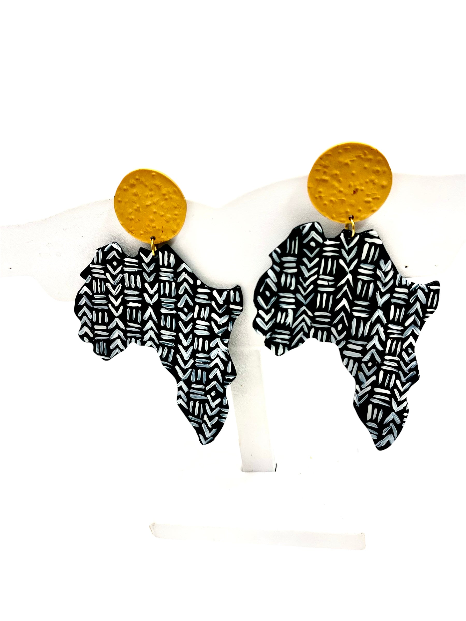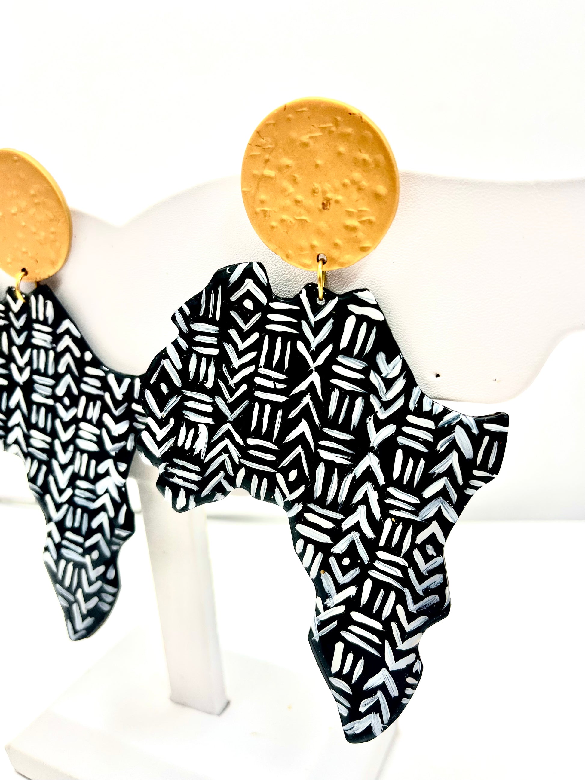 These Hand painted African mud cloth printed earrings make a bold statement piece for any outfit. The intricate handmade design adds a unique touch to your wardrobe. These earrings look heavy, but are very lightweight and comfortable for all day wear!