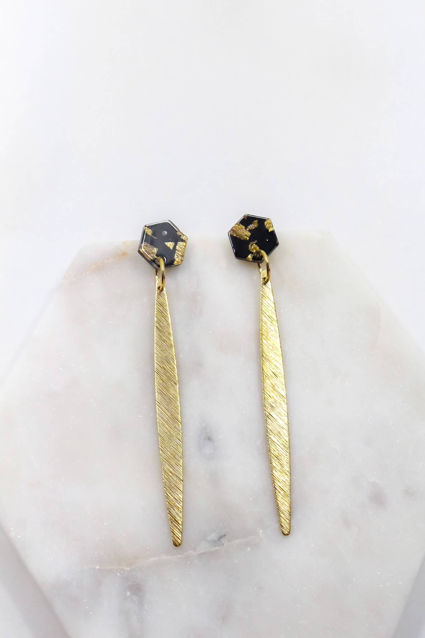 Black and Gold Confetti Hex Earrings | Designer Jewelry | She She's Closet