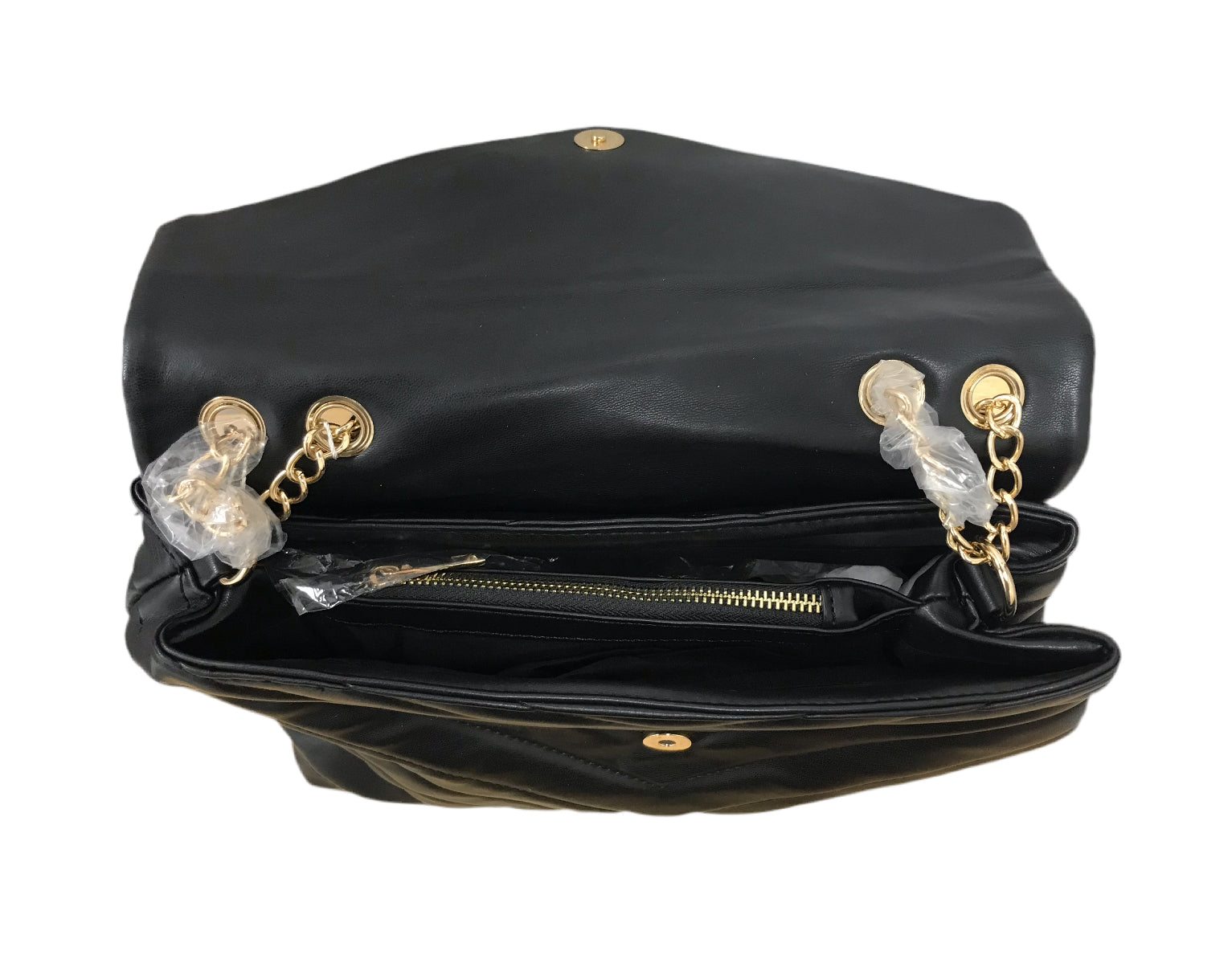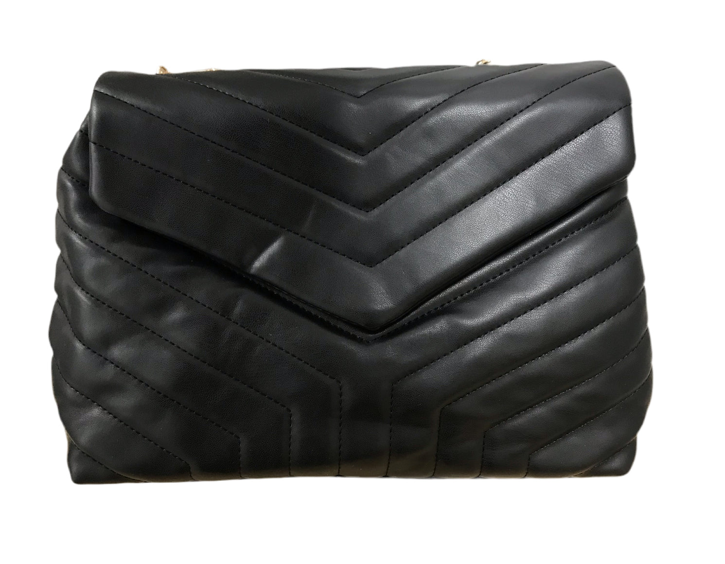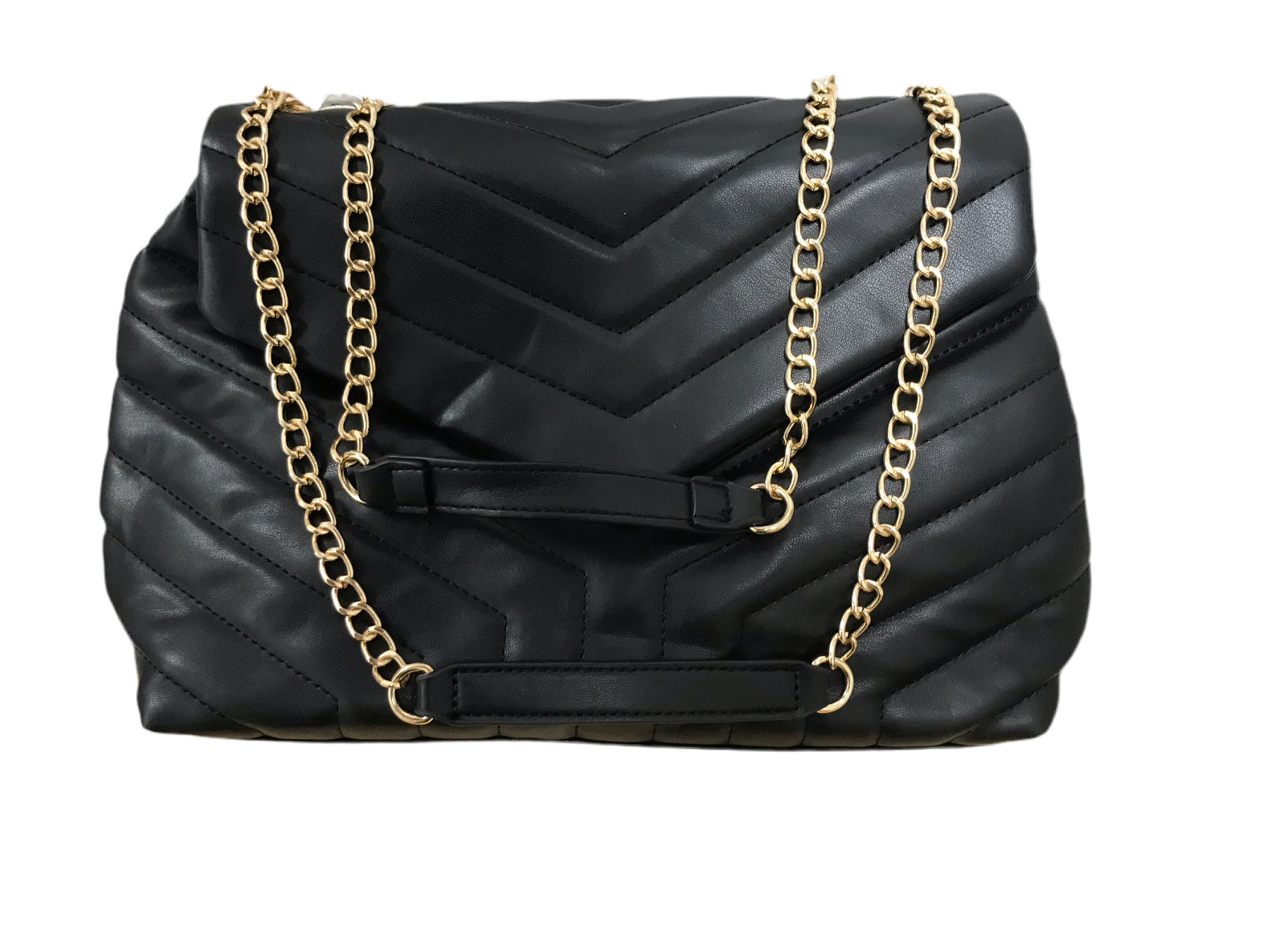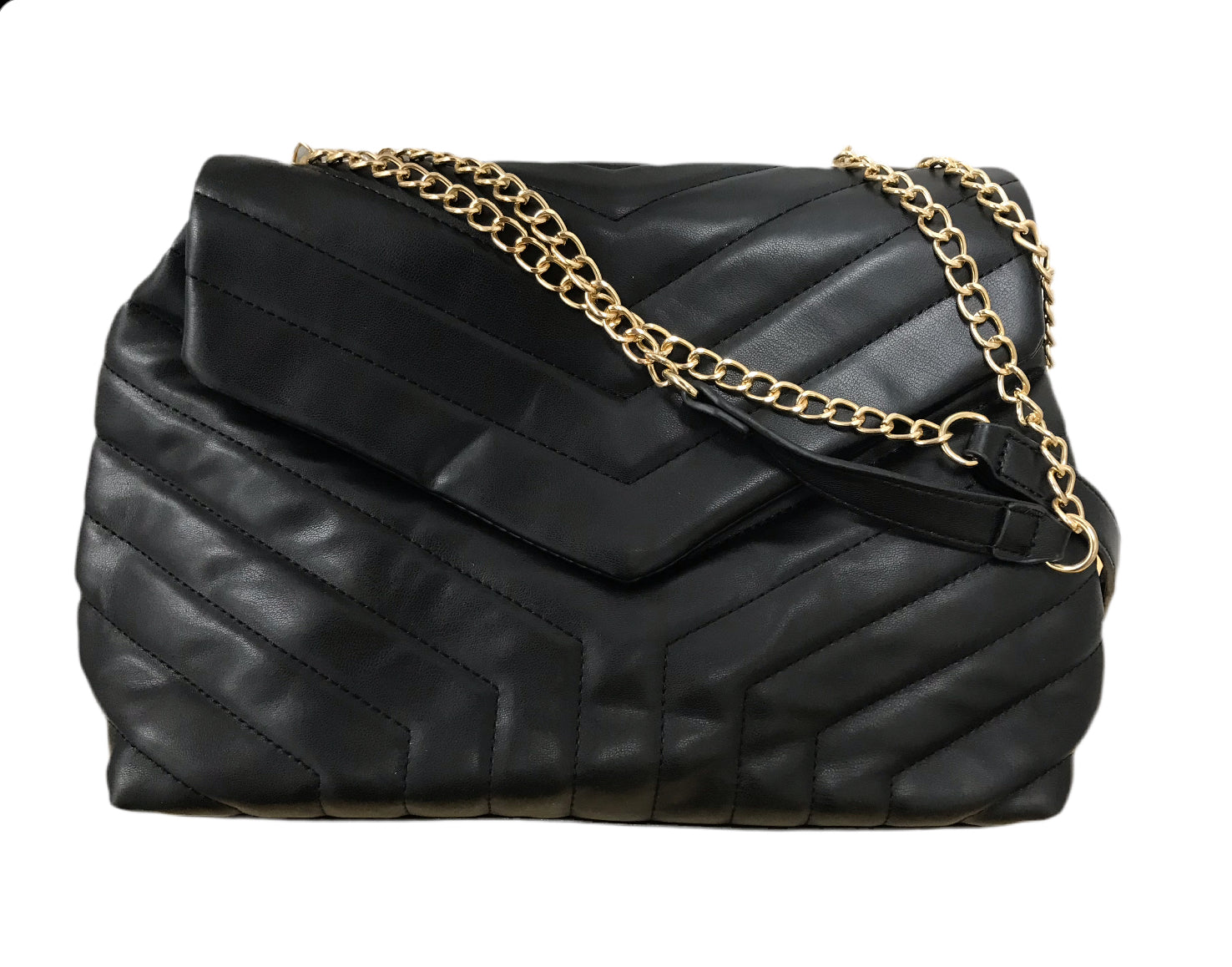Black Vegan Leather Bag with V Details and Double Gold Link Chains