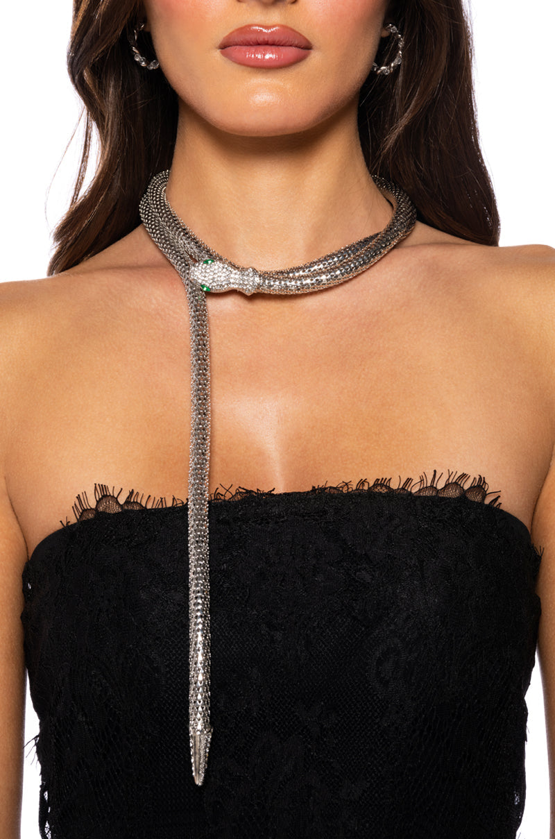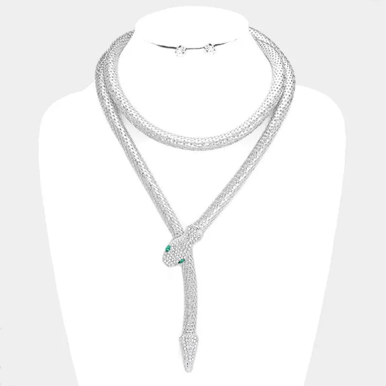 The Serpent Gem Necklace Set boasts a stunning wrap-around design with a faux silver metal base. Its rhinestone snake head and tail add a touch of sparkle, while the magnetic closure ensures secure and easy wear. With gleaming gem eyes, this necklace set is the perfect accessory for any outfit.