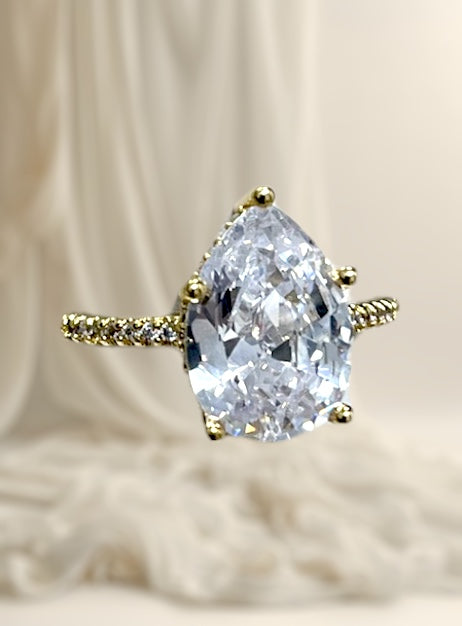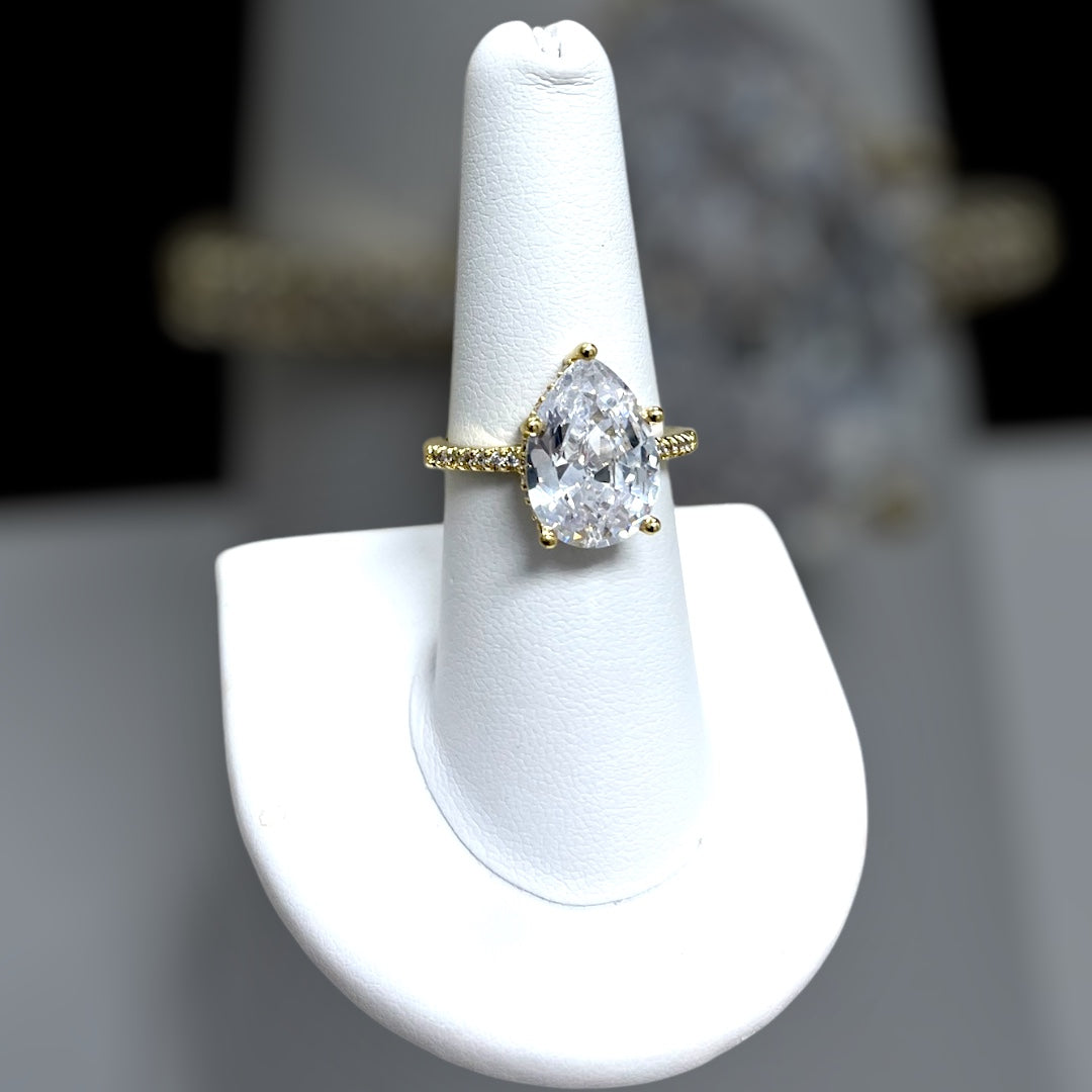 Indulge your senses with Nora Pear Cut Ring. Featuring a luxurious cur CZ gemstone, this ring exudes elegance and style. The pave CZ designed band made of tarnish resistant gold plating and stainless steel base, adds a touch of class and durability. Elevate any look with this classic and timeless piece.