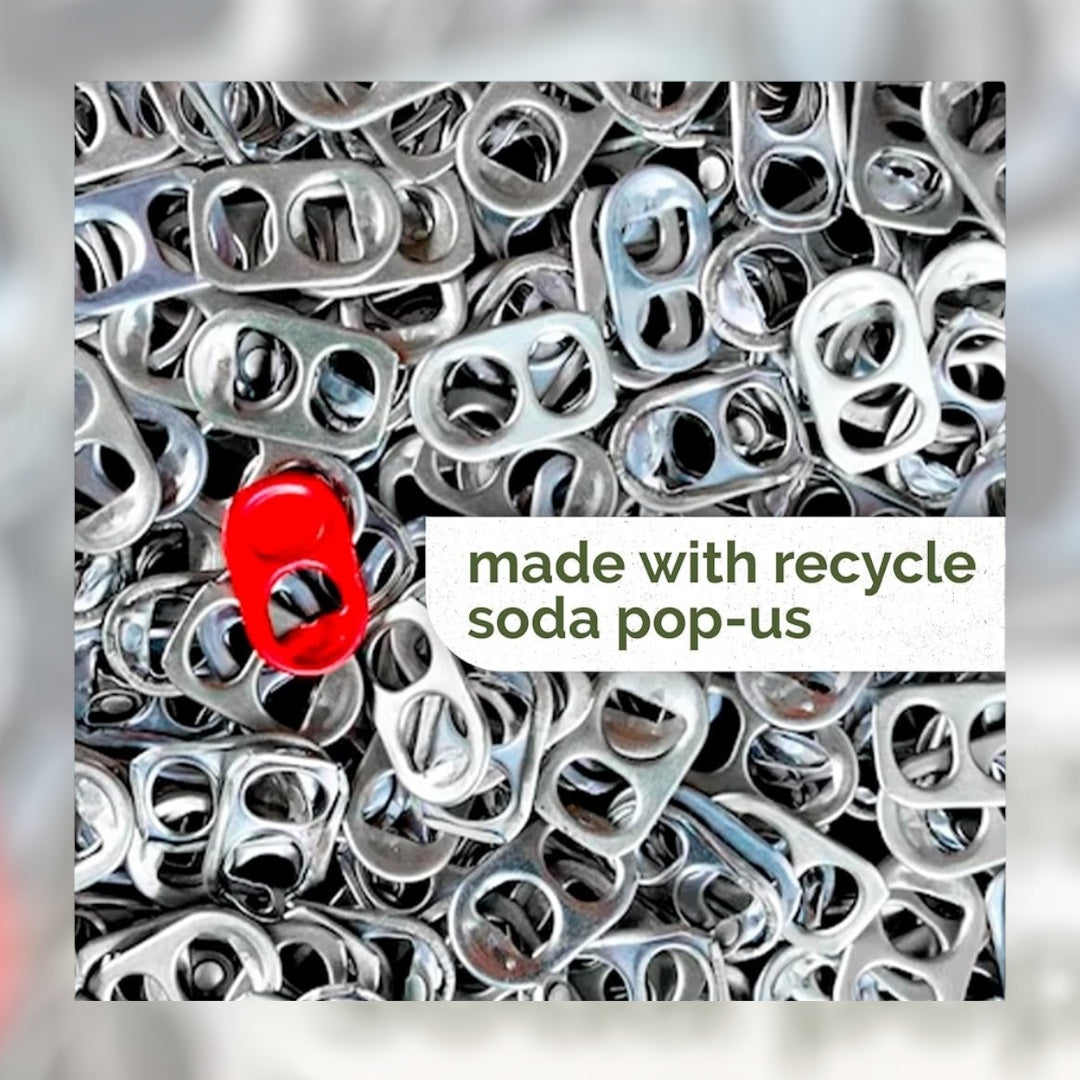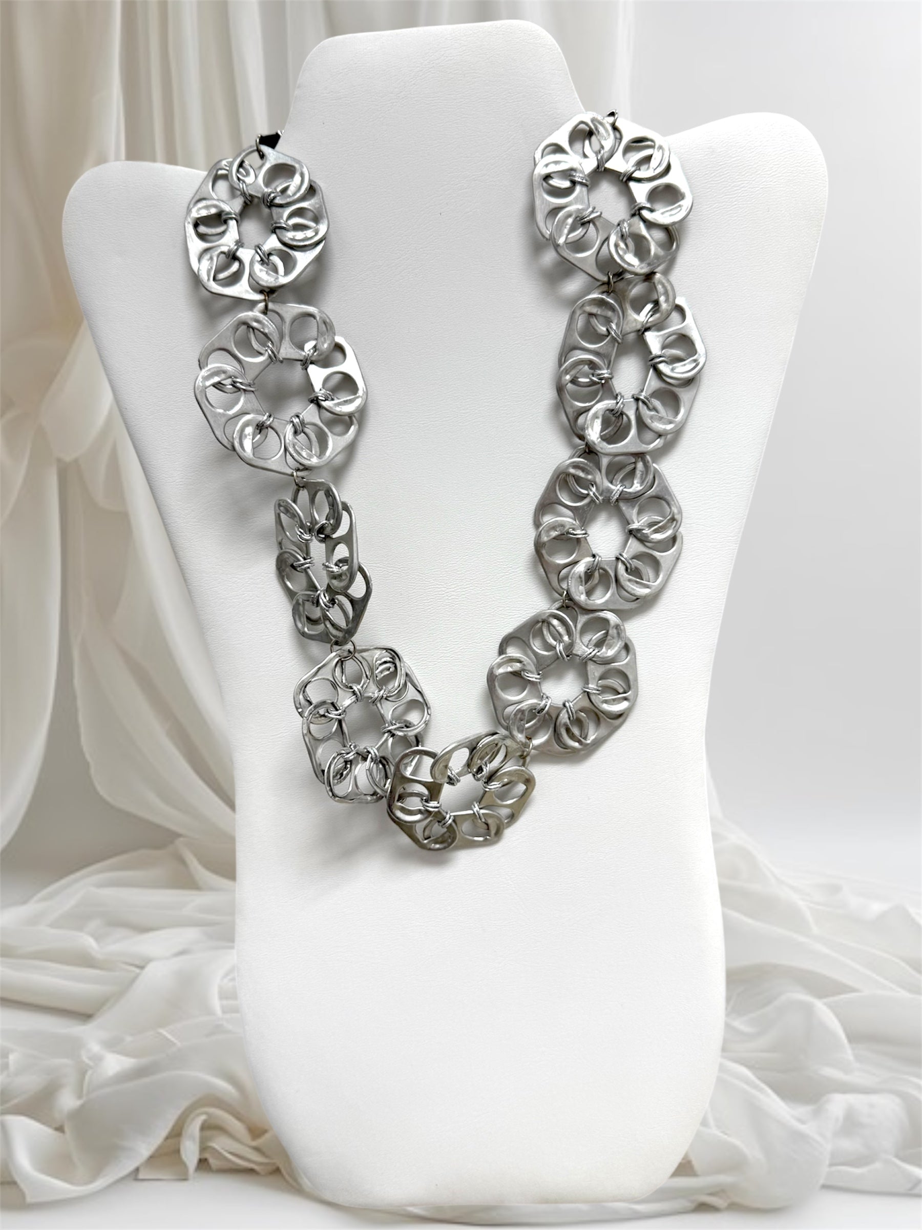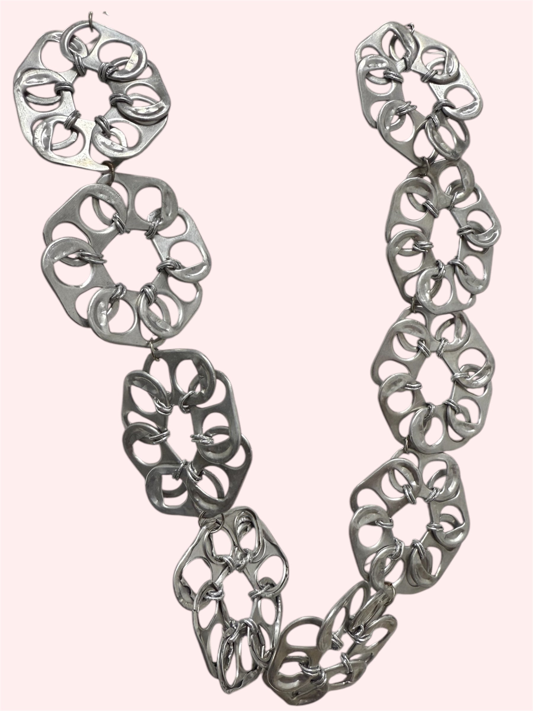 This stunning necklace features a unique flower design made from recycled soda can pop-ups. With a quality cotton cord, it's the perfect addition to any outfit. Elevate your style while reducing waste with this eco-friendly accessory.
