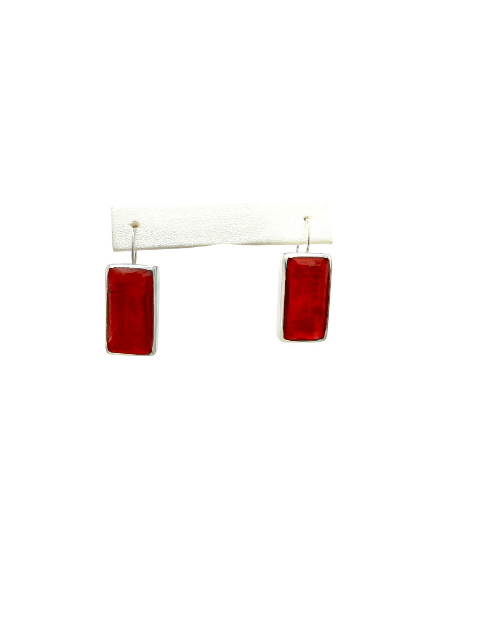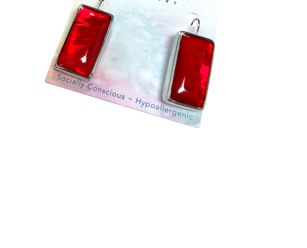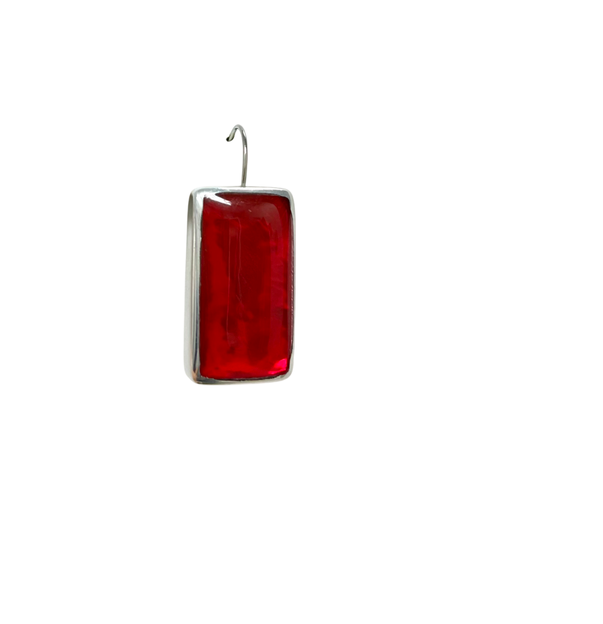 These unique earrings boasts a deep, red color stain and a shimmering glass marble effect, making it a statement piece for any outfit. The unique silver chain adds a touch of elegance to the pendant design. Enhance your look with this one-of-a-kind stained marble glass earrings.