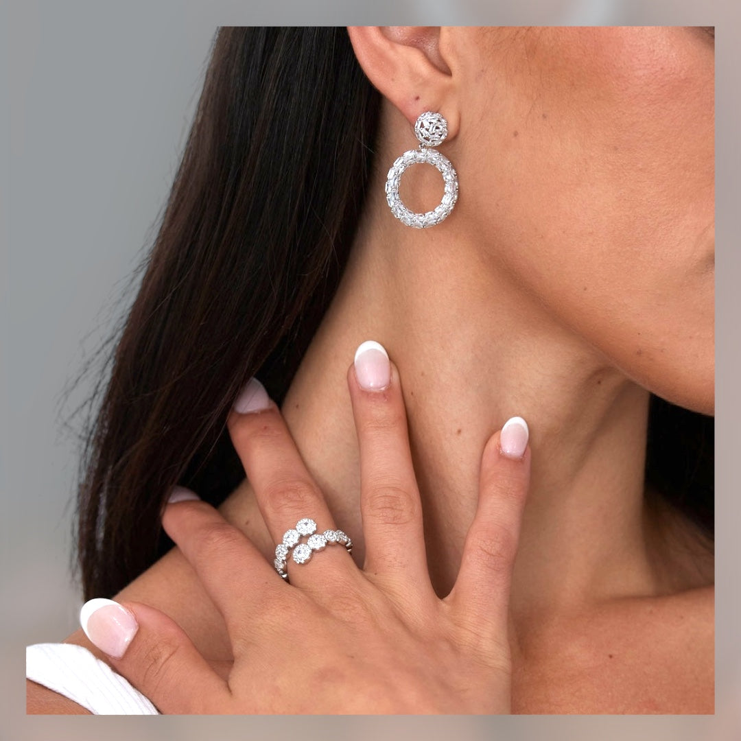 Elevate your look with the Crystal Ball Earrings, featuring a gorgeous 1 1/2" drop hoop, accented in CZ stones.