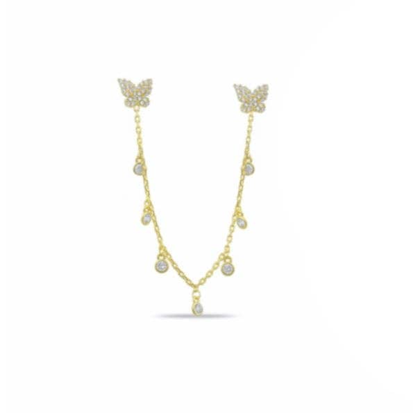 Use your two holes in one ear to showoff these unique sryle earrings Elevate your ear game with our Double Butterfly Stud Chain Earring, exclusively at She She’s Closet. Crafted from .925 sterling silver and gold-plated, these dainty earrings feature sparkling crystals that catch the light with every movement. Designed for multiple pierced ears, this stylish accessory adds a touch of whimsy and elegance to your ensemble.