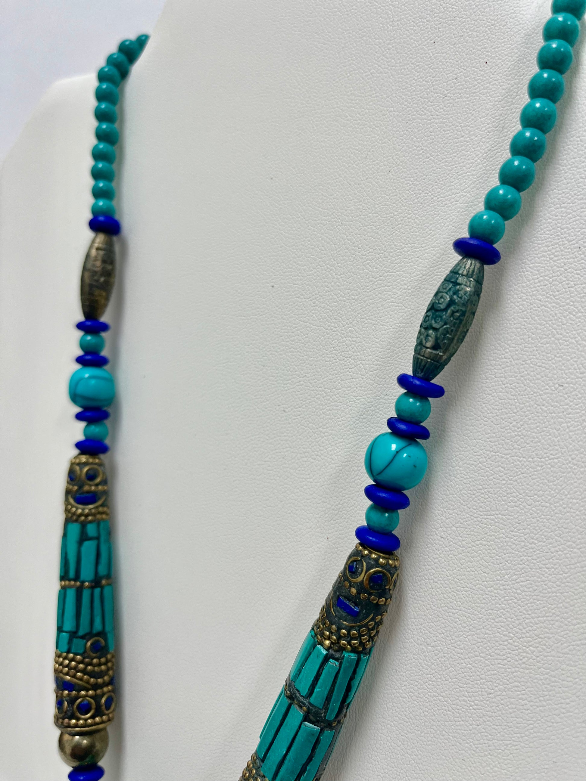 Expertly crafted with intricate ethnic beaded stones, this necklace showcases beautiful elements of real turquoise beads and gold detailing. Handcrafted by skilled artisans, this unique piece adds a touch of elegance and cultural flair to any outfit. Elevate your style with this stunning multi-beaded necklace.