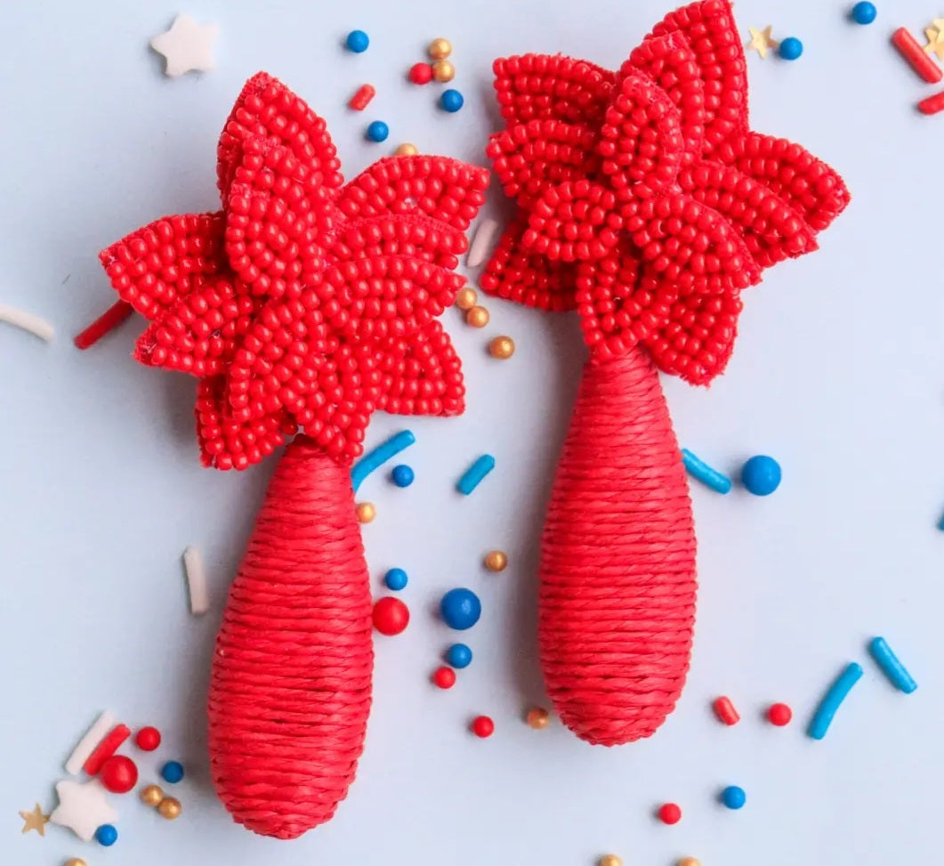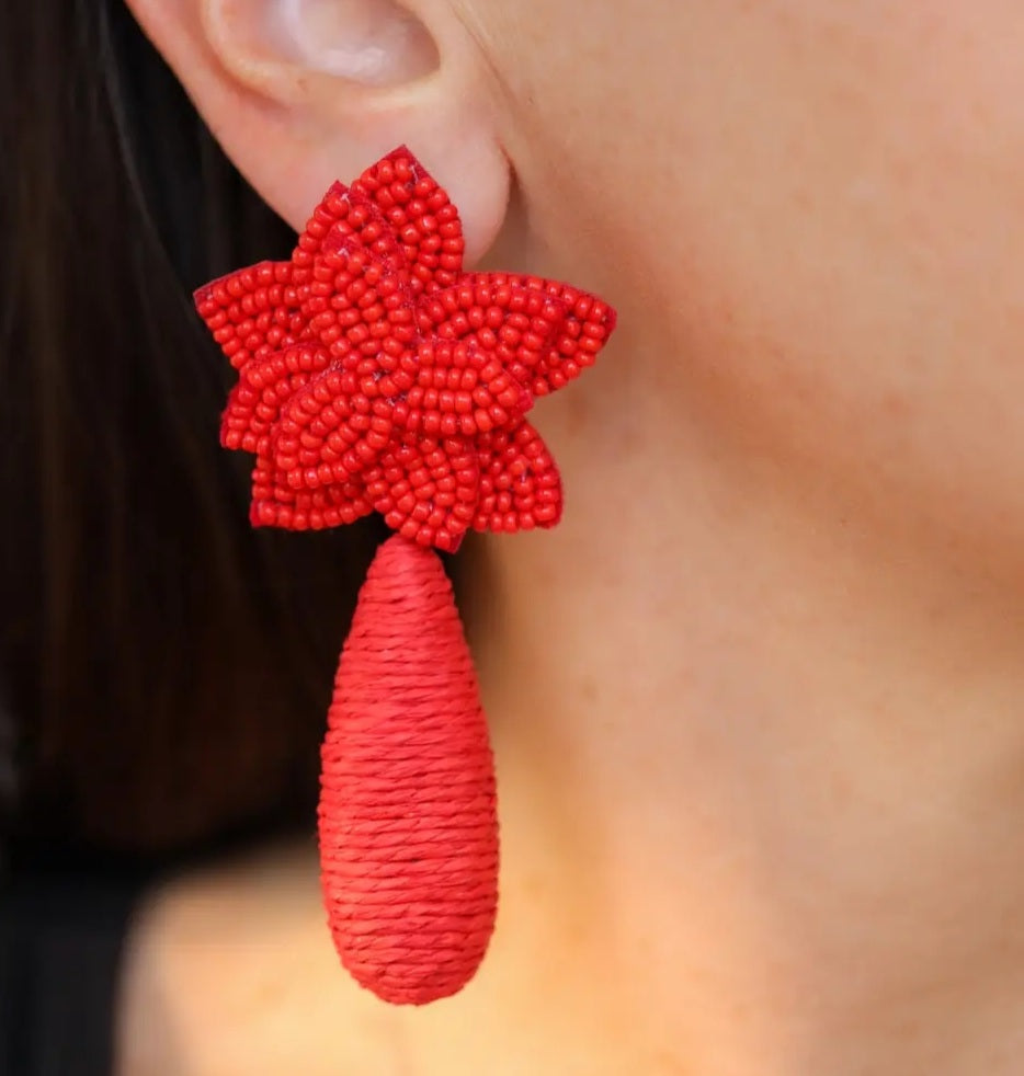Flora Dangle Earrings are blooming with beauty! A bold ruby-red beaded flower with a raffia wrapped Dangle. They are perfect for making a statement- without saying a word.