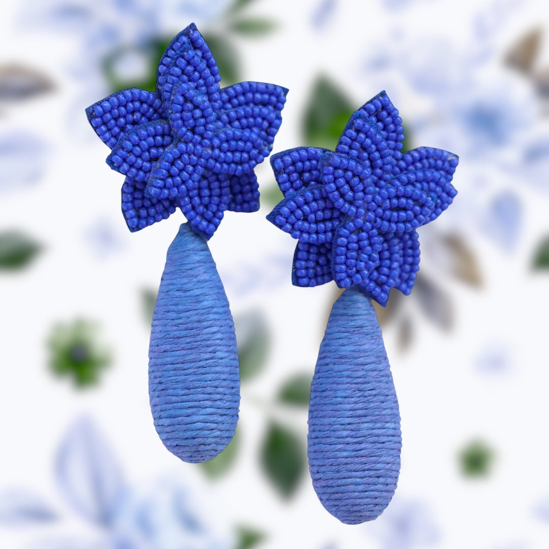 These Flora Dangle Earrings are blooming with beauty! A bold sapphire-blue beaded flower with a raffia-wrapped Dangle. They are perfect for making a statement- without saying a word.