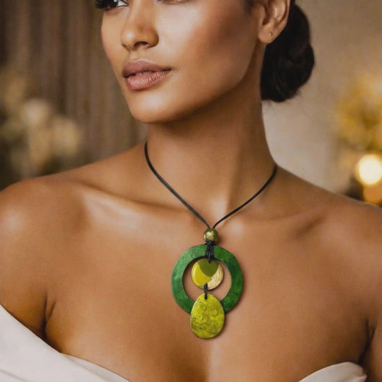 green pendant necklace, boho necklace, circular pendant, bangle pendant, yellow accent jewelry, cord necklace, statement jewelry, layered pendant, summer accessory, handmade style, eco-friendly feel, artisan-made, adjustable