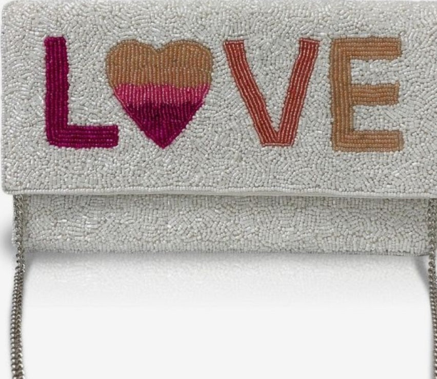 Embrace love in style with our Handcrafted White Seed Bead "Love" Motif Clutch. Order yours today and make a statement at your next event!