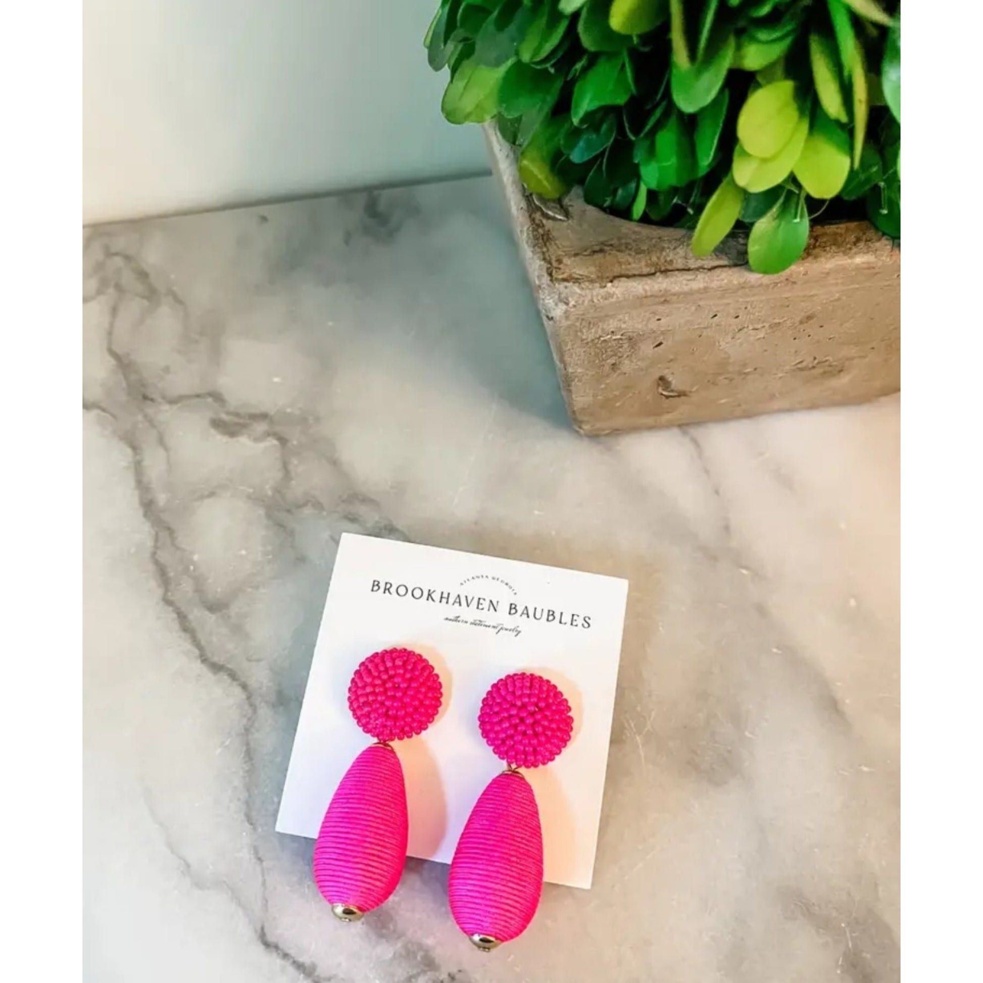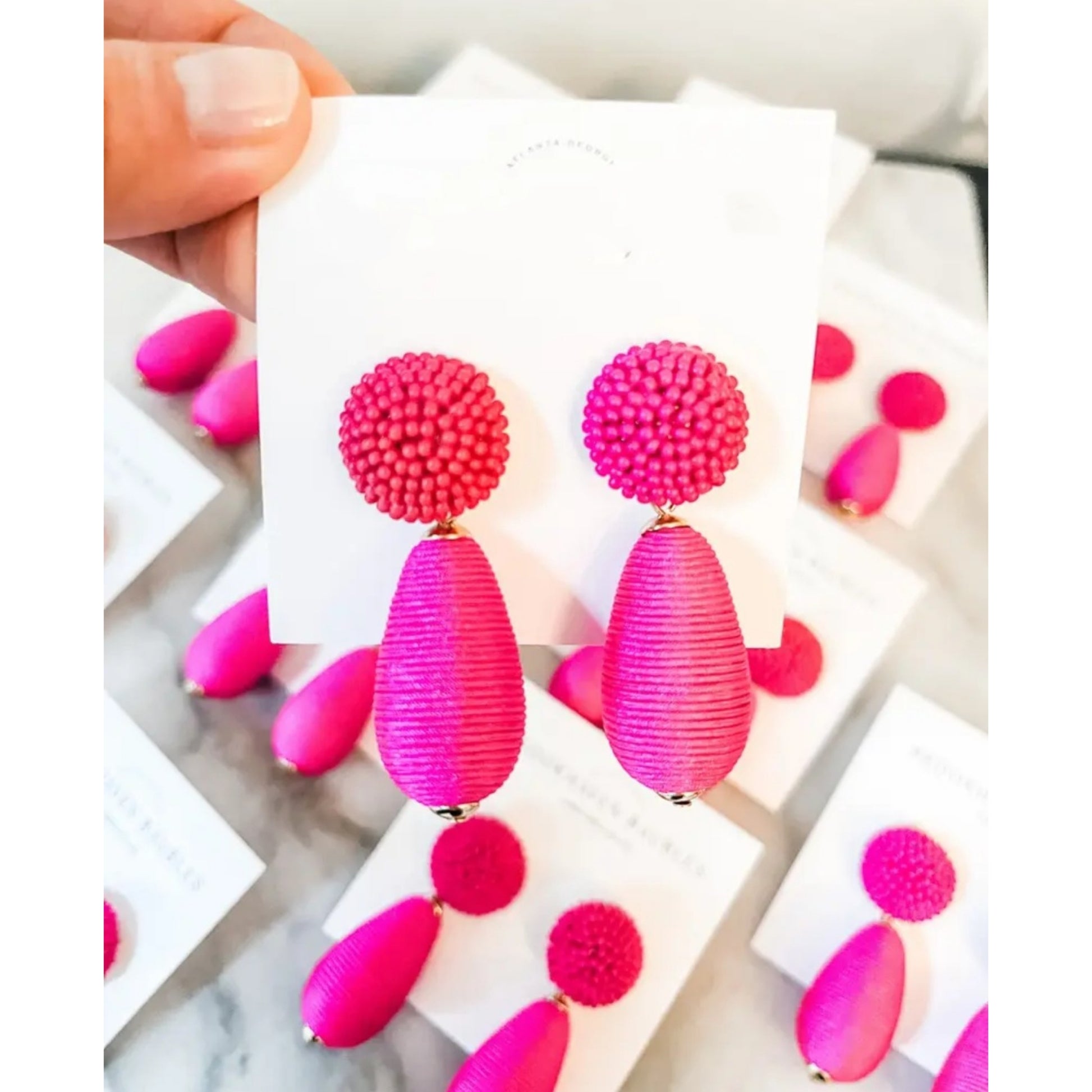 Showstoping Hot Pink Dangle Post Earrings made from epoxy and thread. The top portion of the earring is formed by tiny dots which make a perfect circle. The bottom portion of the earring is fitted with a contrasting pink thread, creating an ideal dangle earring.