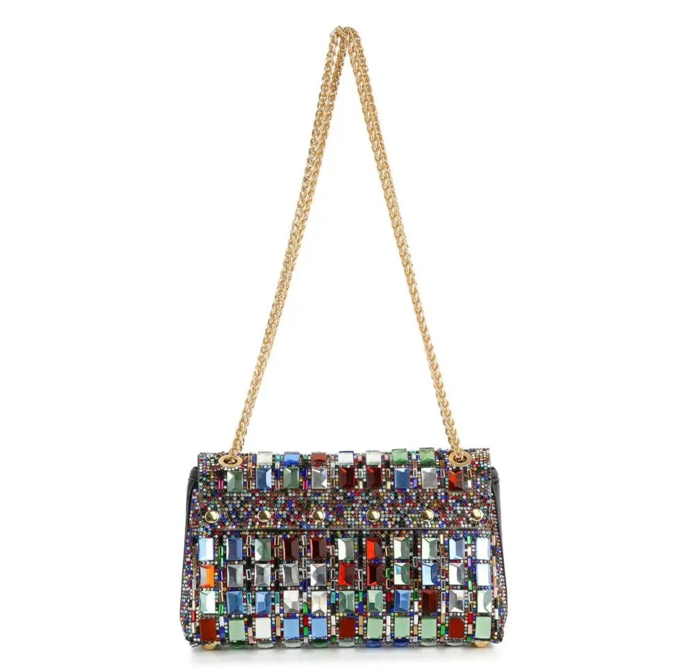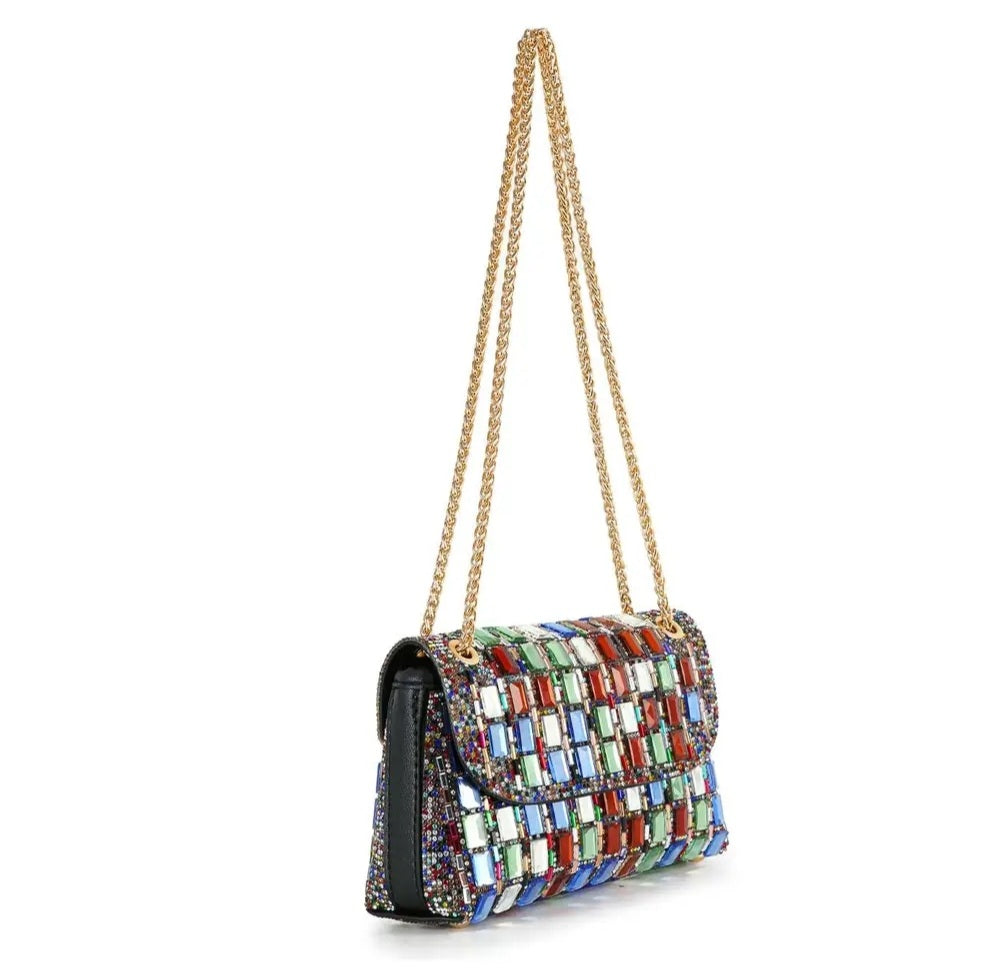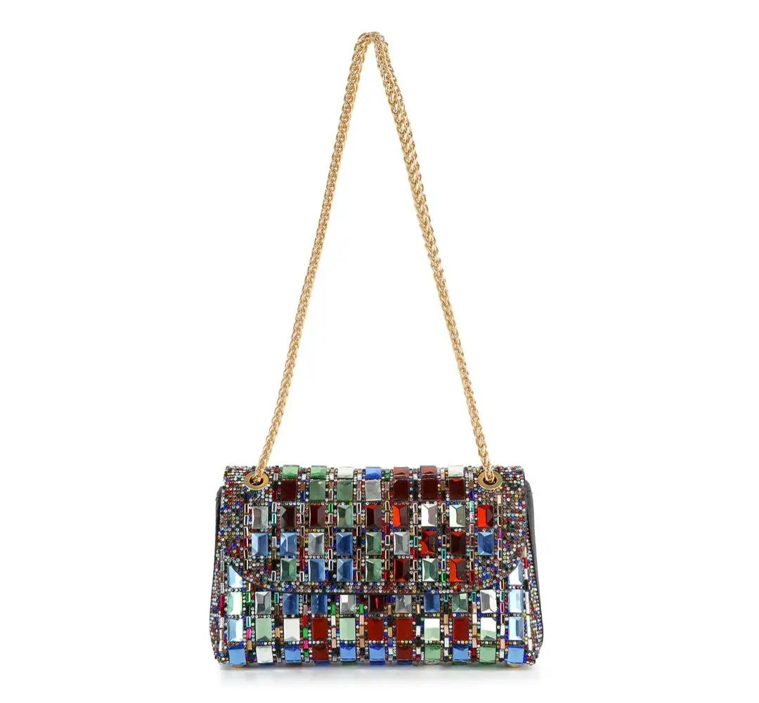 Introducing the Kaleidoscope Clutch Bag — a stunning accessory inspired by the mesmerising patterns of a kaleidoscope. This eye-catching clutch features vibrant, colourful crystal mirror patterns that mimic a kaleidoscope's symmetrical, ever-changing visuals, creating a captivating display of colour and light. Surrounded by tiny, shimmering dots, the design reflects a kaleidoscopic burst of hues, making it the perfect statement piece for any occasion.