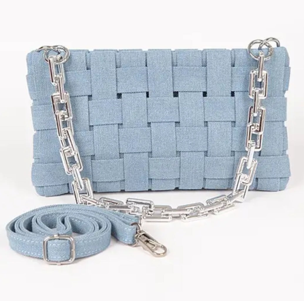 This Blue woven denim clutch bag will highlight your denim wardrobe. Get on board the denim train. This handbag in a choice of dark and light denim comes with a silver link short chain and a denim crossbody strap or use as shoulder bag, carry as a clutch Ths bag is a four way.