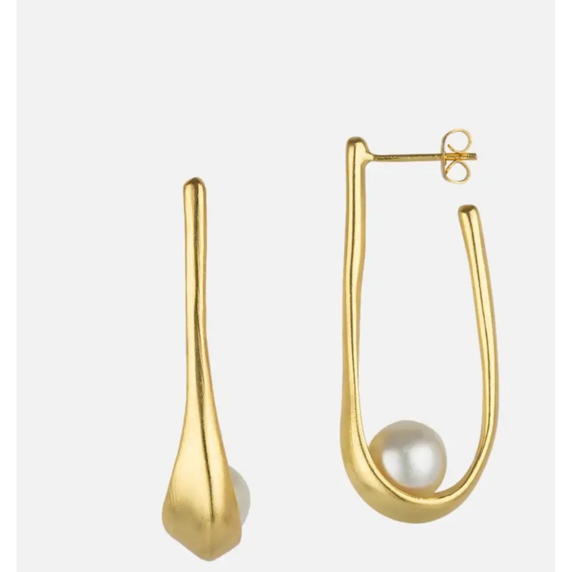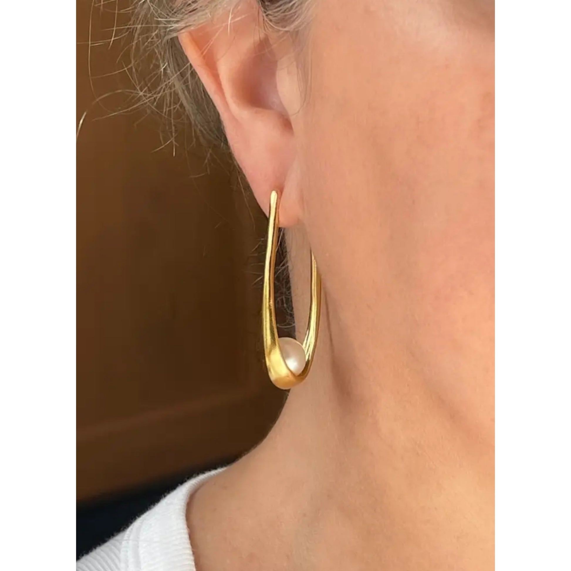 A hoop is a hoop from any direction. Not this pair, the pearl is nestled inside the hoop, displaying a modern twist on an old classic a hopp from one direction and a hoop from another adding major interest to any look. This sophisticated matte gold hoops will enhance your style. They are made with 22 Karat Gold Plating and Brass with Faux Pearls. The hoops measure 1 3/4 inches in length with posts.
