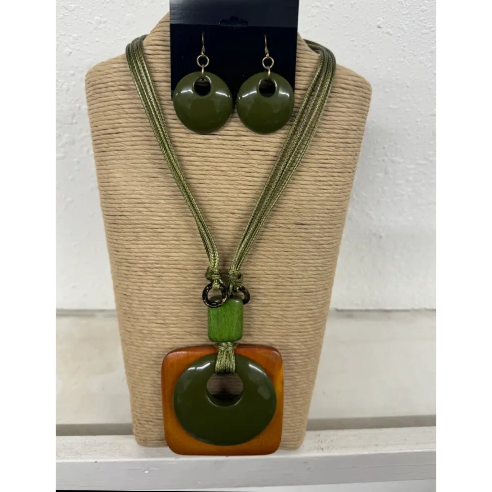 Each piece is meticulously handcrafted, reflecting Filipino artistry and craftsmanship. It is perfect for adding a pop of color and cultural elegance to any outfit. Handcrafted Philippines, green wax cord, green circle earrings, square pendant, rust colour, vibrant jewellery, Filipino craftsmanship, statement necklace, colourful accessories, artisanal jewellery.