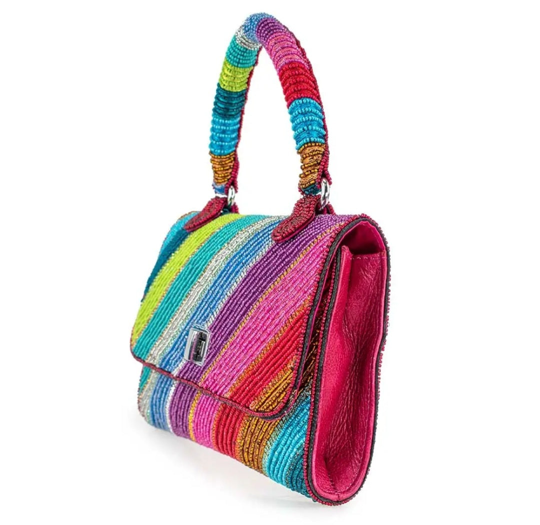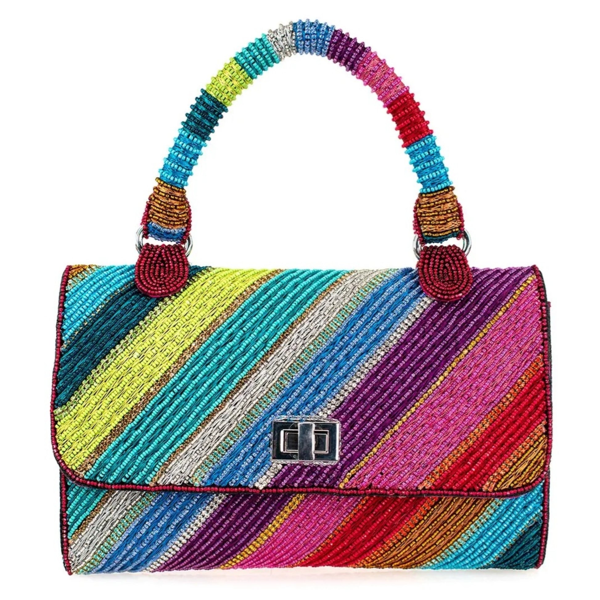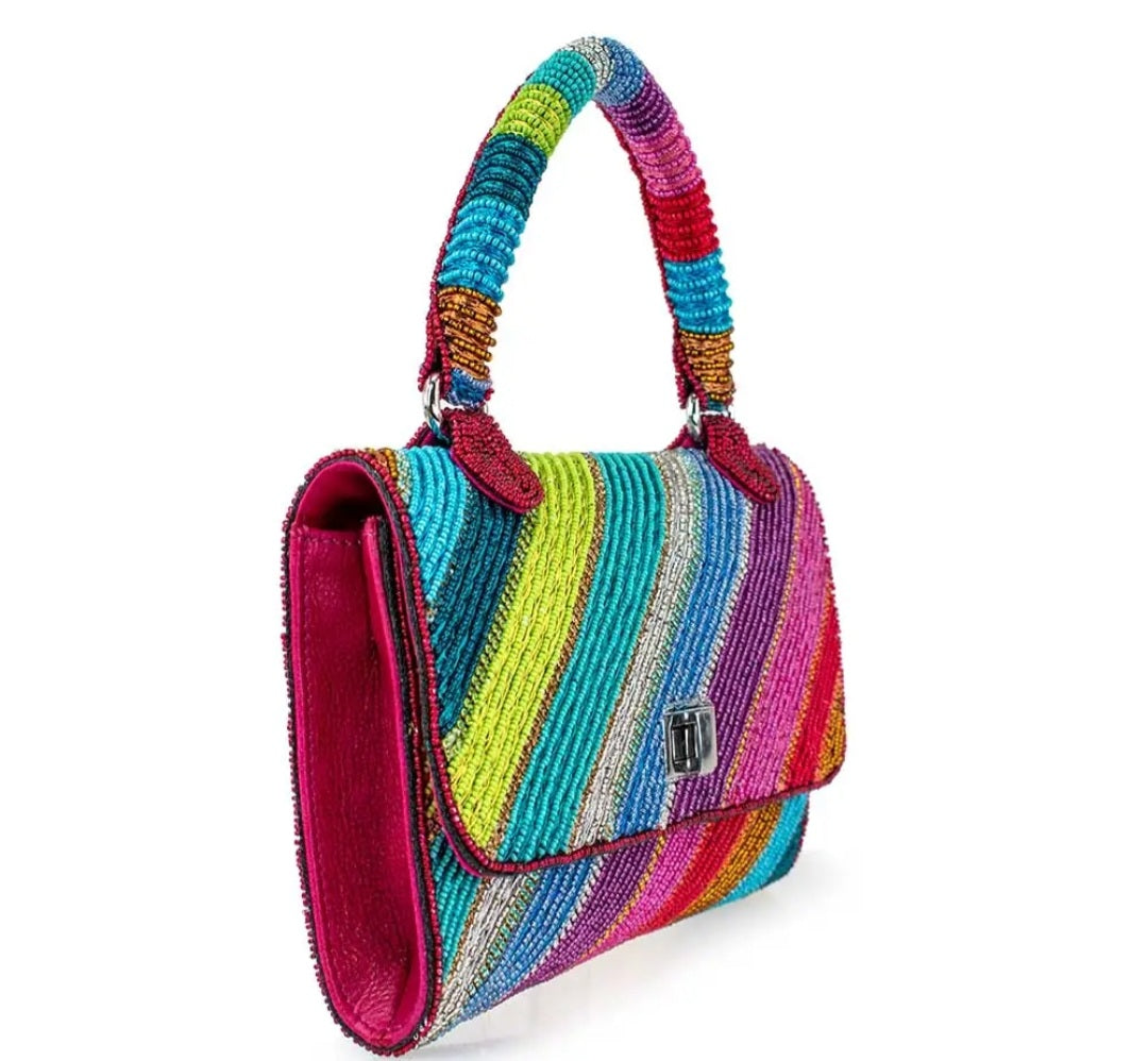 Elevate your style with our Out of the Line Striped Top Handle Handbag, a stunning accessory that combines vibrant design with exquisite craftsmanship. This eye-catching handbag features a unique rainbow-hued beaded work that is handcrafted with care, ensuring that each piece is as unique as you are.