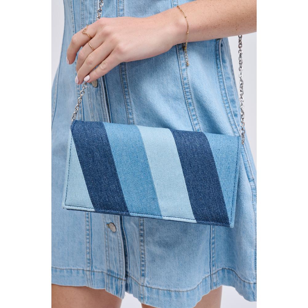 A denim delight with a modern twist. The magnetic snap closure and contrasting shades of denim exude urban vibes, while the detachable silver chain strap adds an edgy touch. Inside, find a fabric-lined interior with a slip pocket, making it the perfect blend of style and practicality for your on-the-go adventures. Item Type: Crossbody Material: Polyester Closure: Magnetic Snap Exterior : Contrasting Shades Of Denim, Silver Hardware, Detachable Chain Strap Interior : Fabric Lined, 1 Slip Pocket 8.875” L x 2.125” W x 5” H