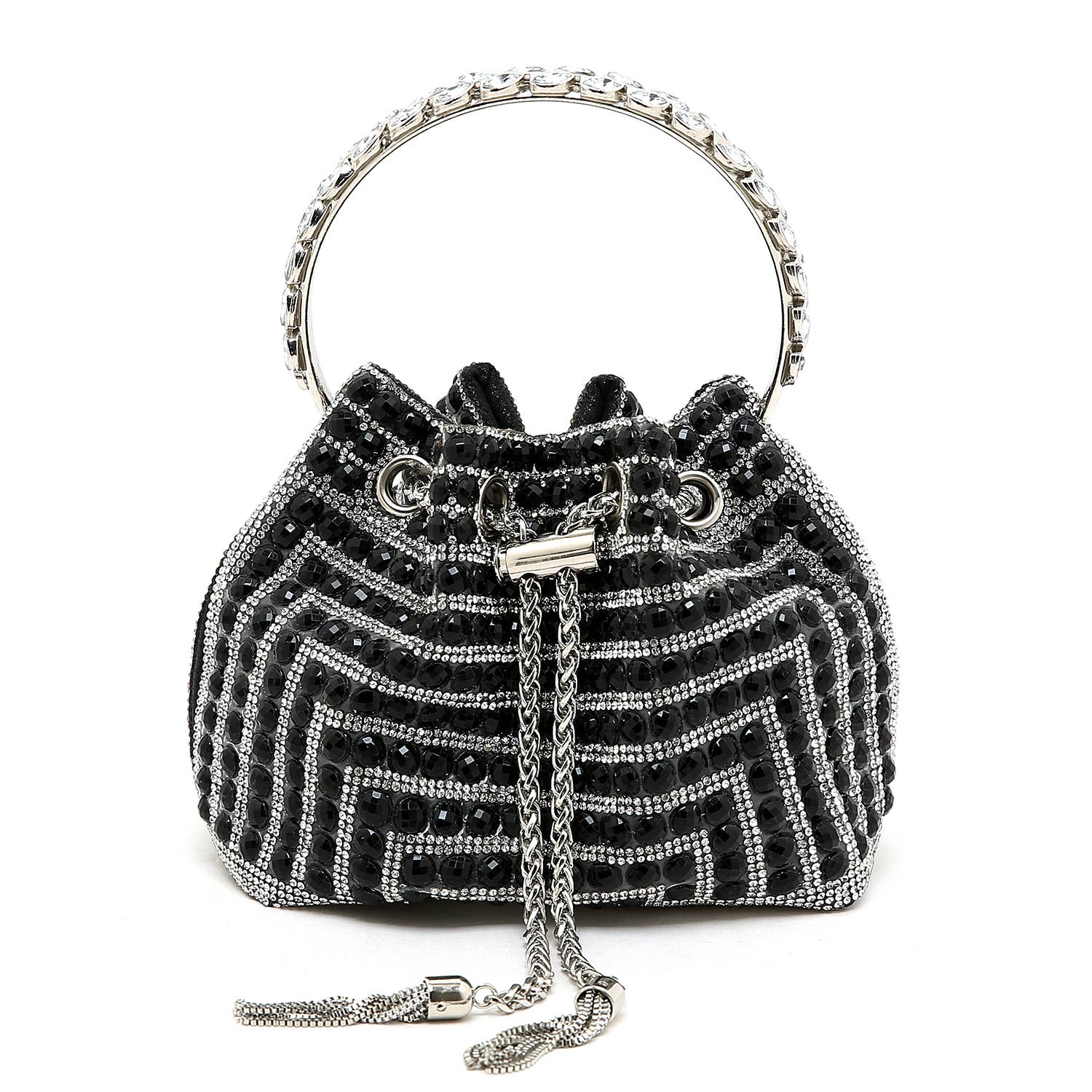 Petit Silver and Black Bucket bag adorned with black Crystal stones embellishment with tiny clear crystals stone accents. Toggle closure with fringe metal tassels Tiny clear floral leaf petals affixed to top handle.