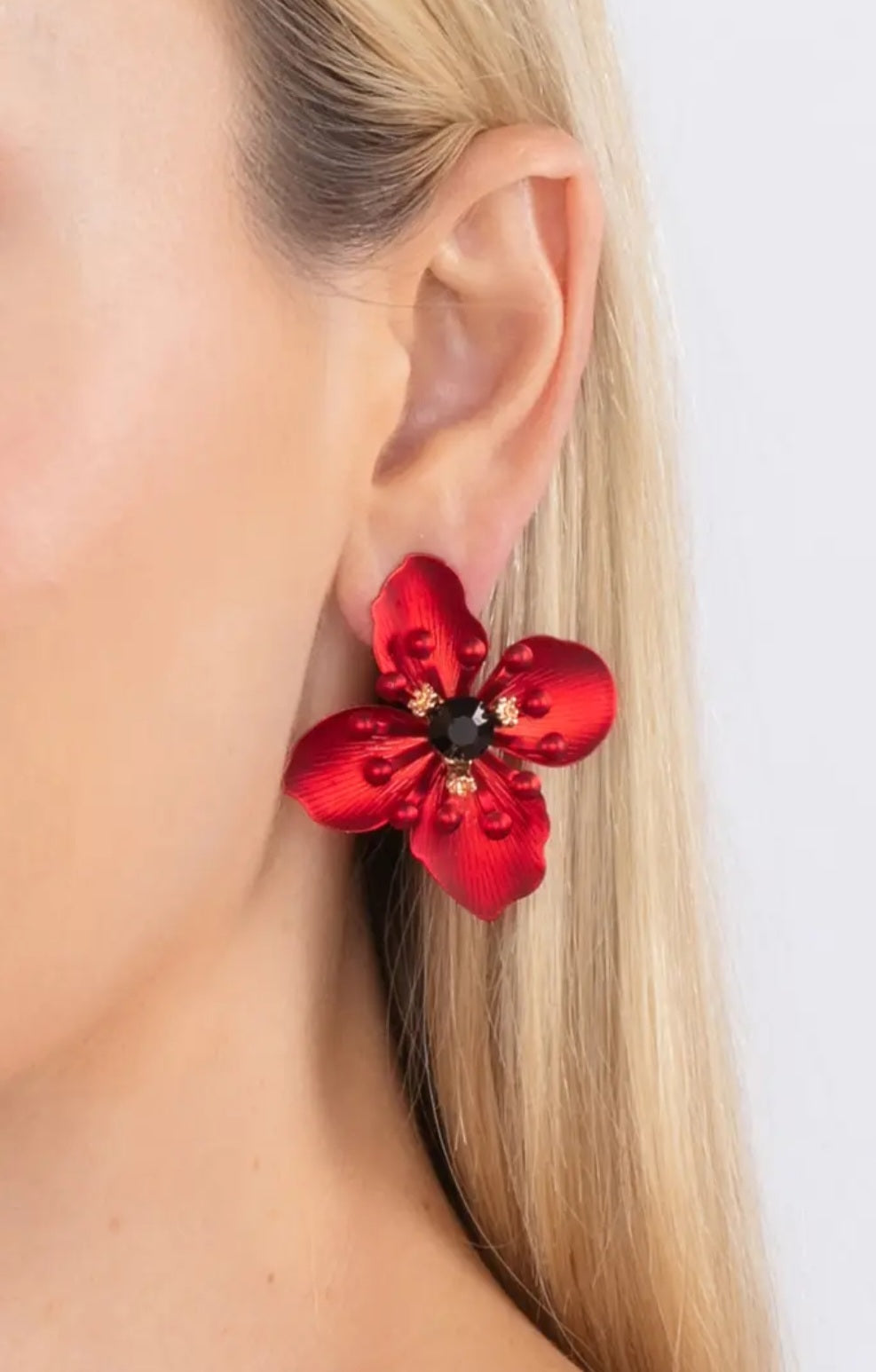 Jasmin flowers vibrantly bloom, revealing twinkling crystals on these statement earrings in the perfect shade of red.