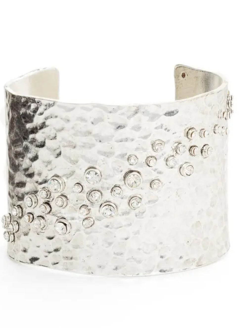 As Seen On - Coax your glamorous, sultry self out of hiding. Our hammered Cuff of precious Sterling Silver Plating and adorned with a diagonal sprinkle of faux diamond crystals on what can only be mathematically hailed as 'bling squared'..