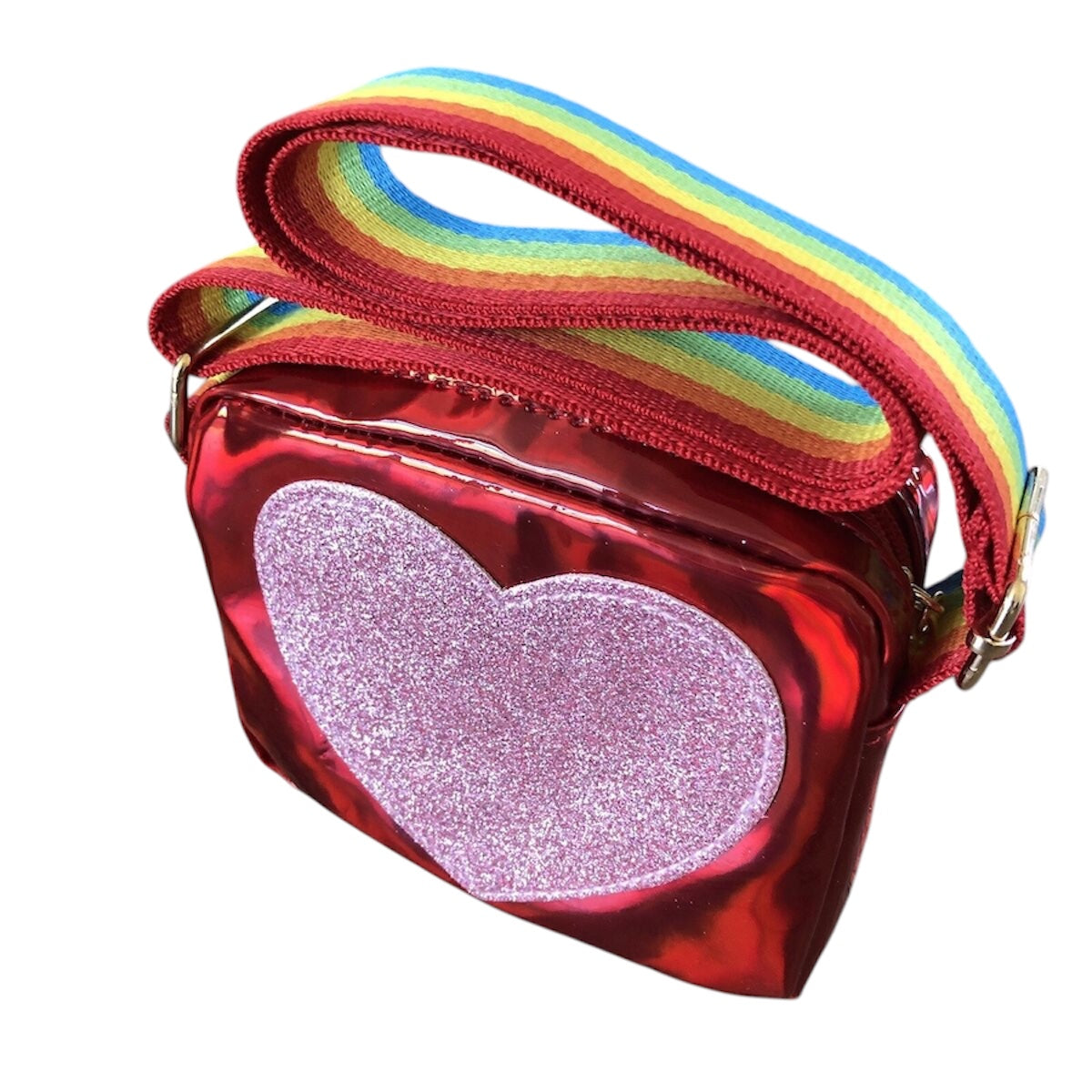 This sparkly pink heart, high-quality PU crossbody bag is perfect for adding a touch of glamour to any outfit. The adjustable strap ensures a comfortable fit, while the red reflective material adds a fun and stylish element. A must-have accessory for any fashionista.