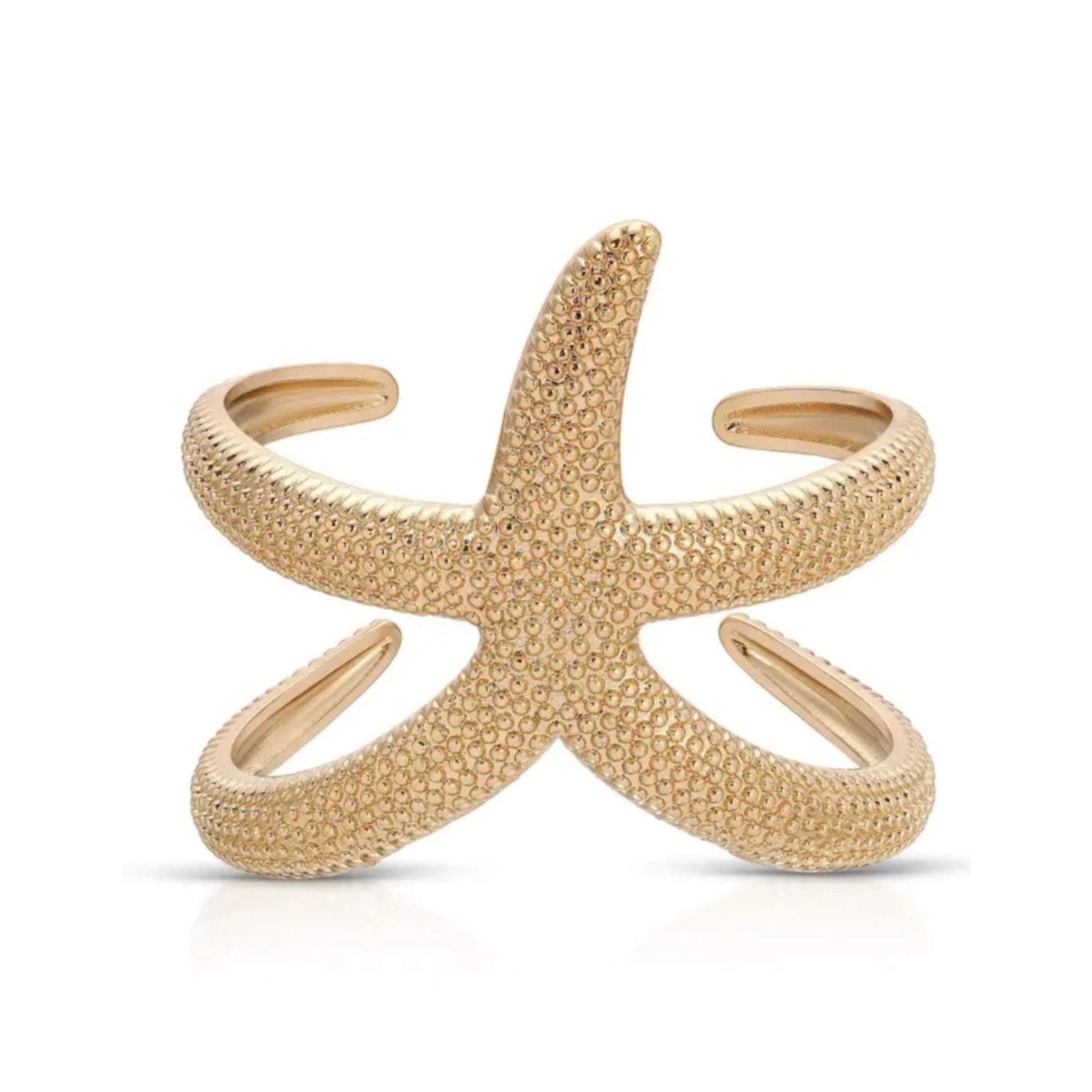Discover elegance with the Starfish Gold Plated Bracelet, a stunning statement piece that beautifully captures the essence of the ocean. Crafted in quality features a captivating starfish design adorned with intricate textures and shimmering details. The Starfish Gold Cuff Bracelet is a versatile accessory for casual and formal occasions, perfect for adding a touch of coastal charm to any outfit. Elevate your jewellery collection with this unique and luxurious piece, symbolising beauty, resilience, and the allure of the sea.