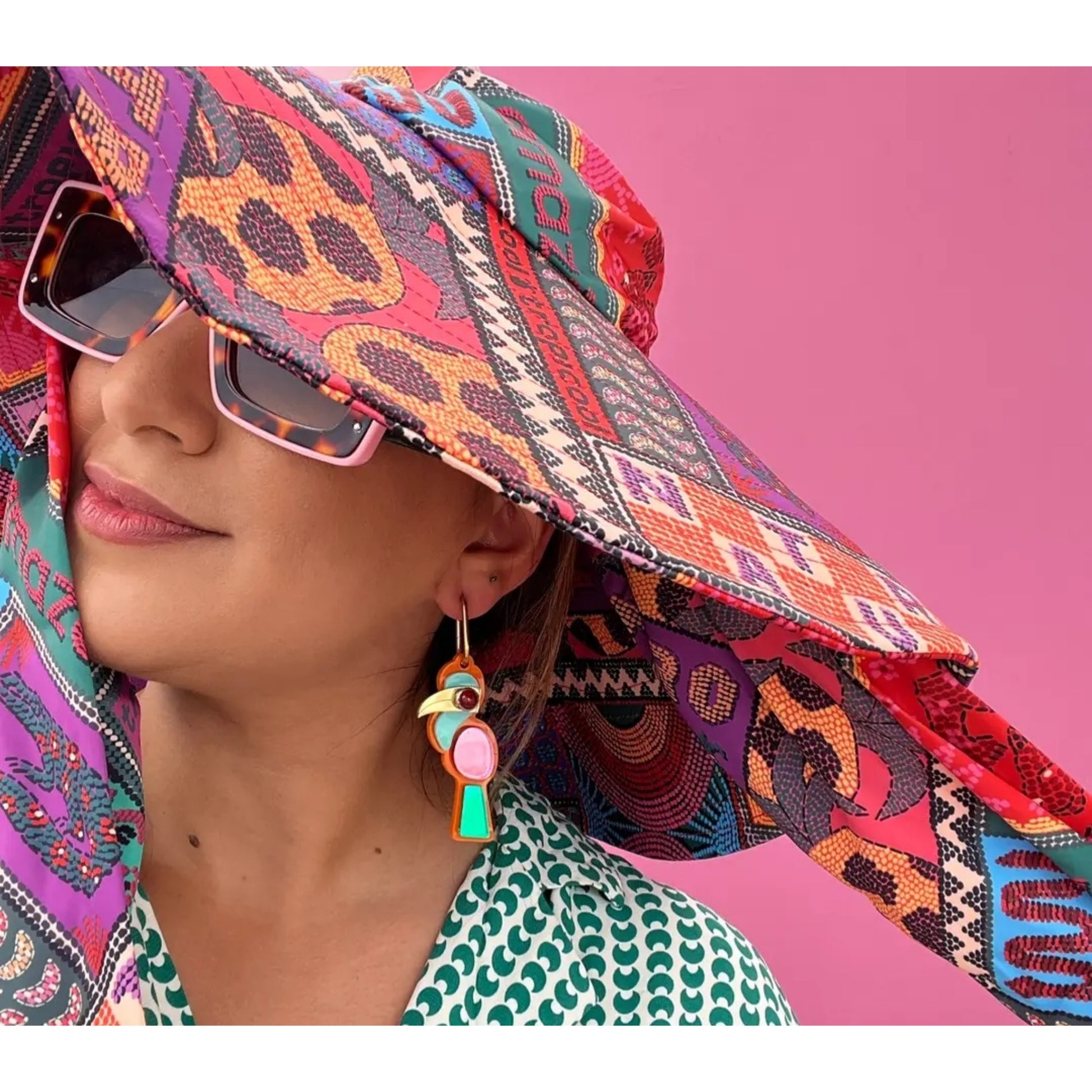 The earrings showcase a striking combination of bright pink, teal, and green hues, perfectly complemented by a faux red stone eye that adds a touch of whimsy. Lightweight and comfortable, these hoop earrings are perfect for any occasion, whether you're dressing up for a night out or adding flair to your everyday look.