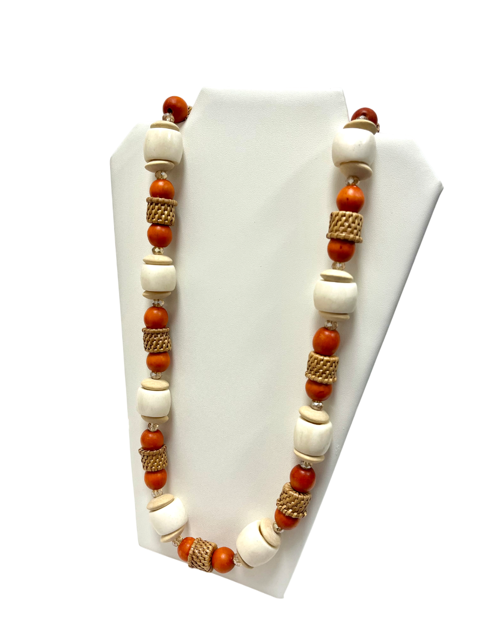 This tribal inspired necklace features hand painted wooden beads in a beautiful burnt orange hue. The carved wooden oval beads and unique "basket designed" beads add a distinctive touch to this unique accessory. Elevate your style with this one of a kind wooden accent necklace.