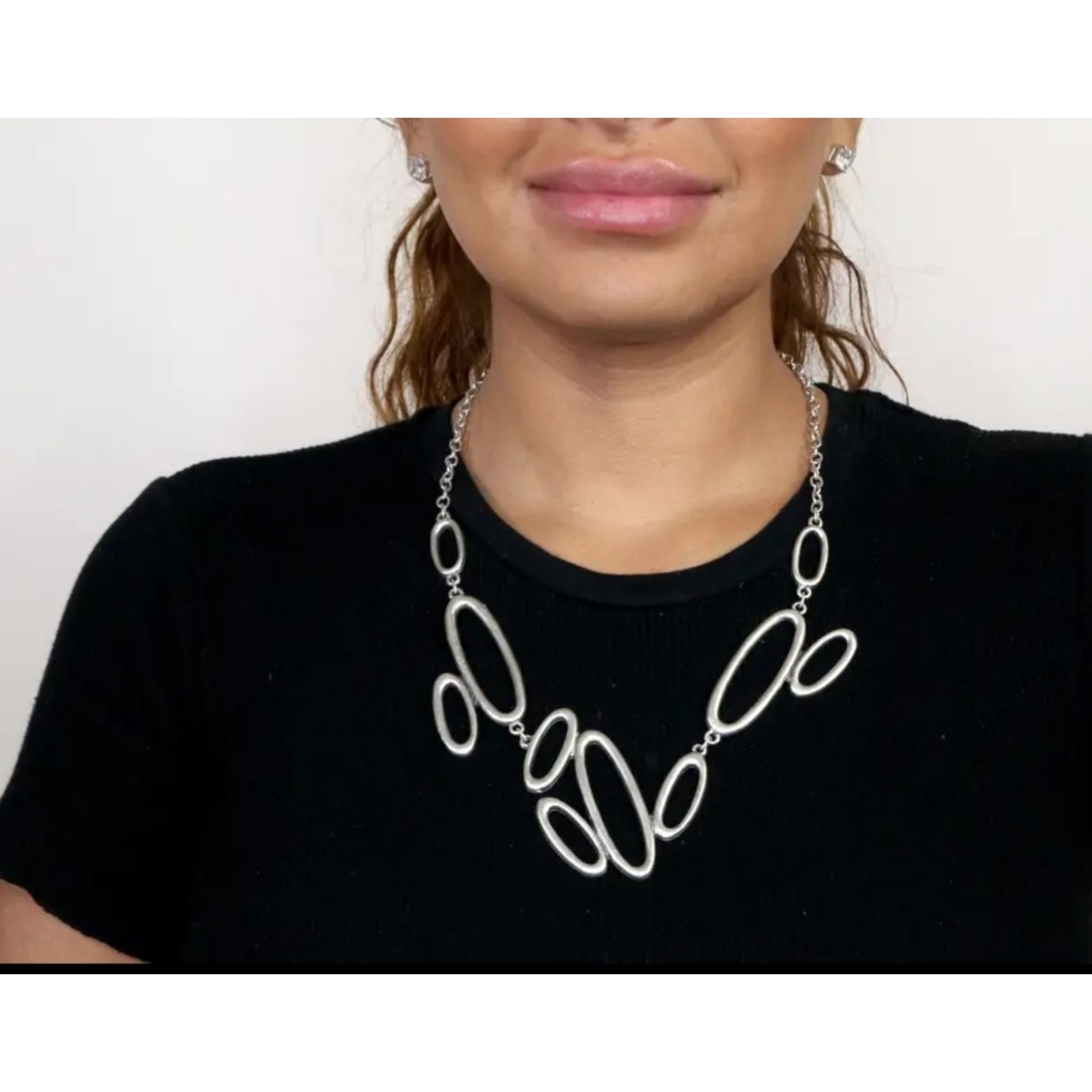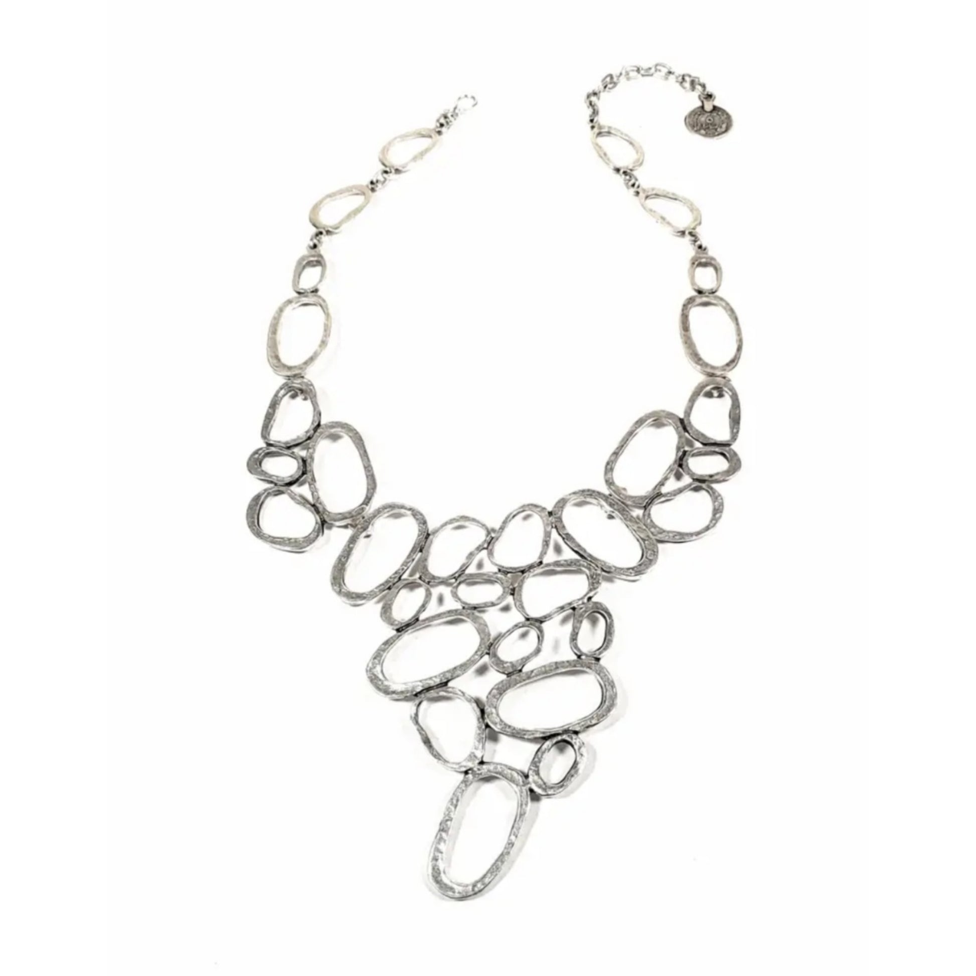 This stunning handmade 925 Sterling Silver Plated and Pewter Necklace. Featuring an eye-catching design of interconnected, irregularly shaped loops that create a bold and modern statement piece. Perfect for elevating any outfit, its unique and artistic style adds a touch of sophistication and contemporary flair. Whether worn casually or for a special occasion, this necklace is sure to turn heads!
