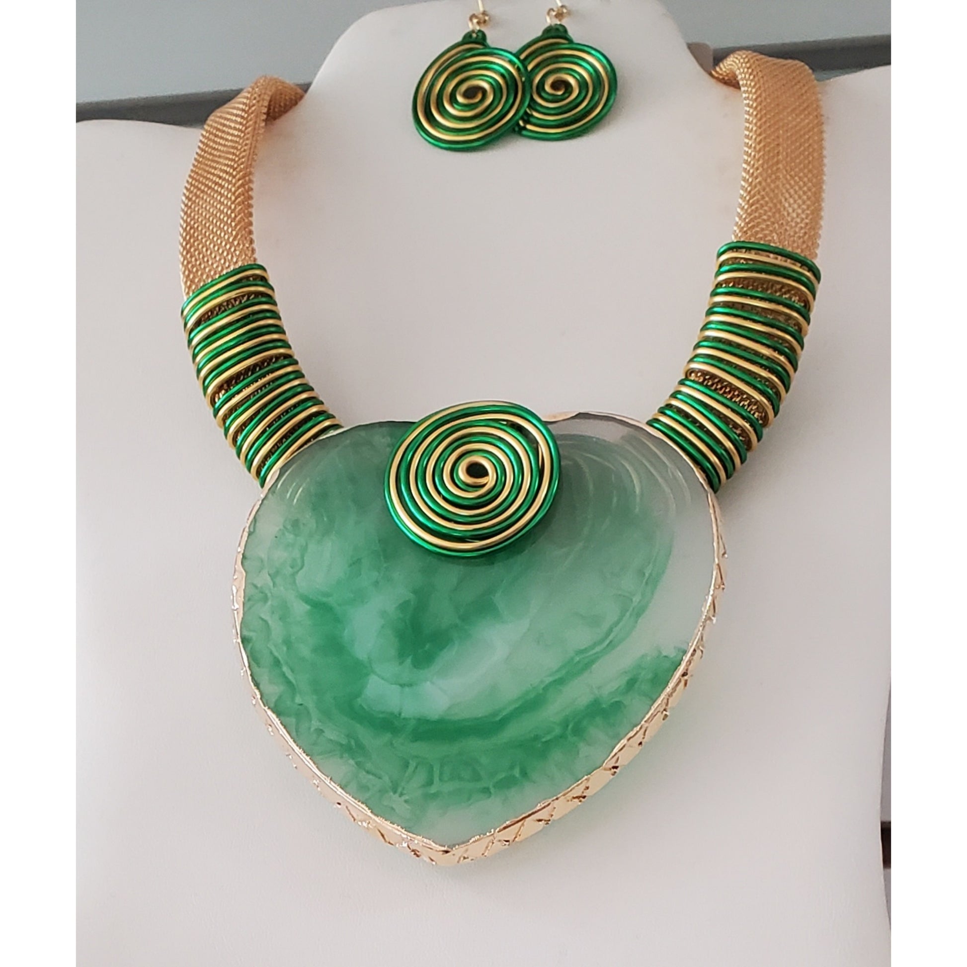 Green Opaque Heart Shape Necklace Set Gold Mesh Accents