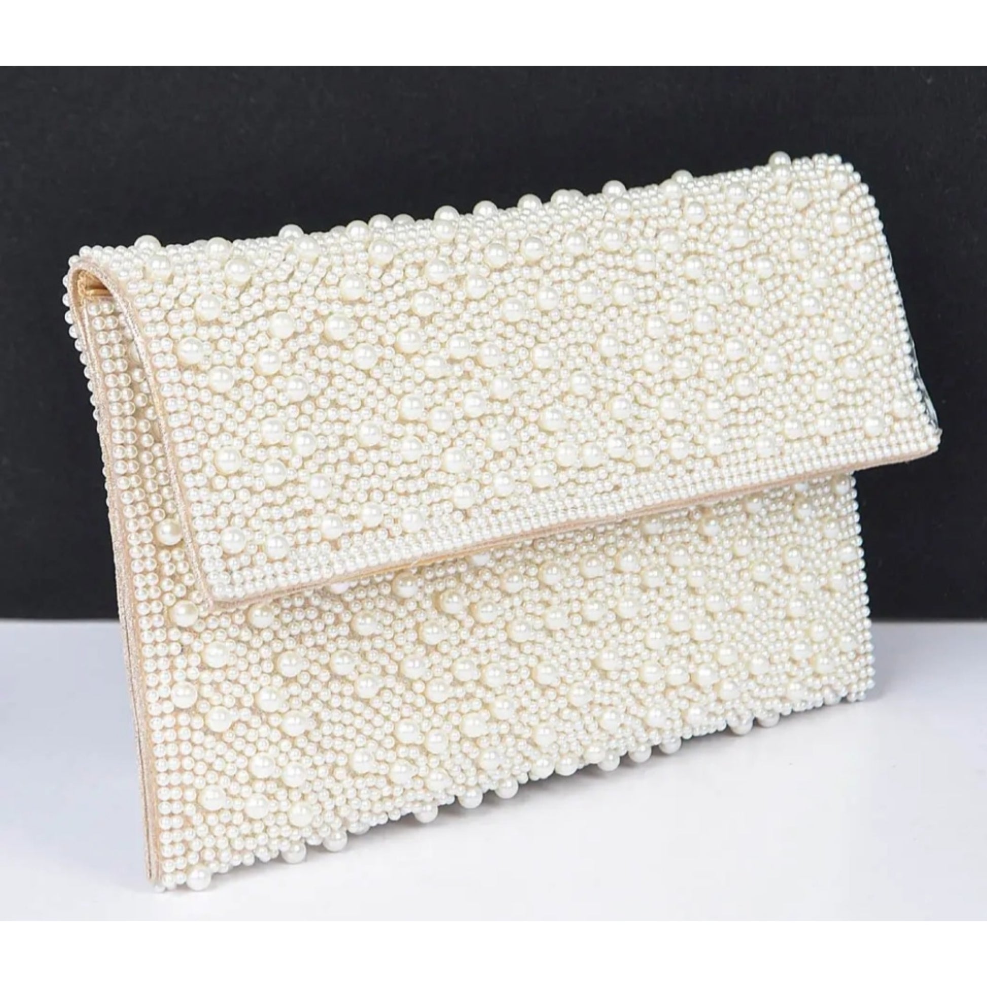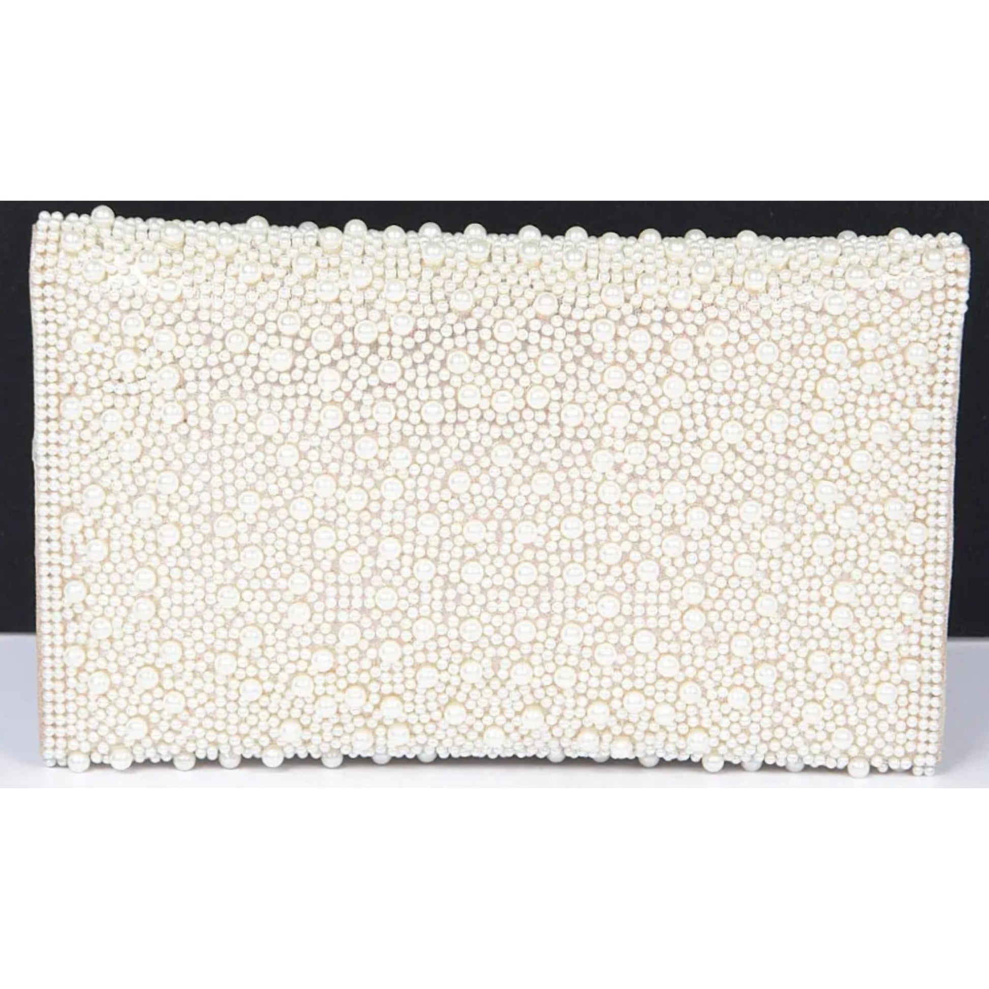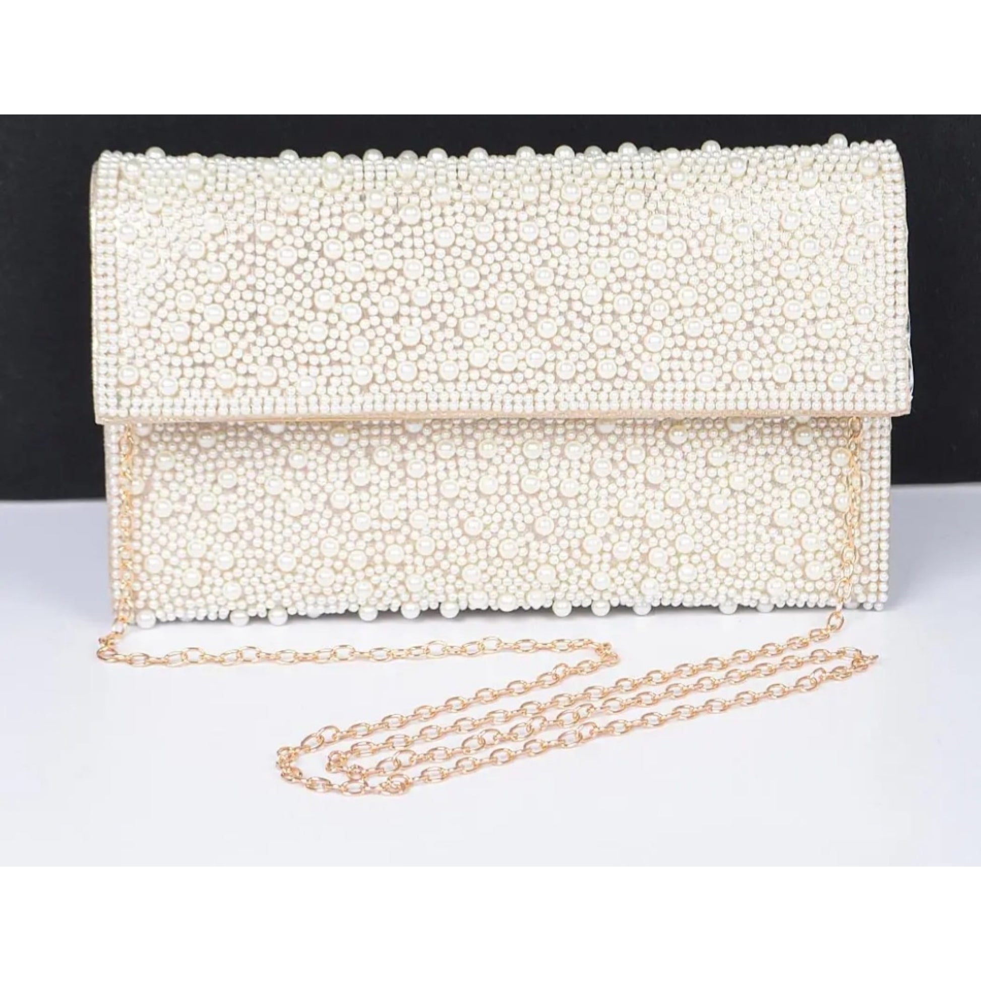 Elevate your evening ensemble with our stunning Pearl Clutch Purse, a perfect blend of elegance and sophistication. Crafted with an exquisite array of assorted size pearls adorning both the front and back, this clutch exudes timeless charm. The soft golden trim adds a touch of luxe, complementing the vegan leather construction for an ethical yet glamorous look. Featuring a sleek chain strap, it offers versatile styling options for weddings, parties, or special occasions. Compact yet spacious enough for your essentials, this pearl clutch is a must-have accessory for fashion-forward individuals.